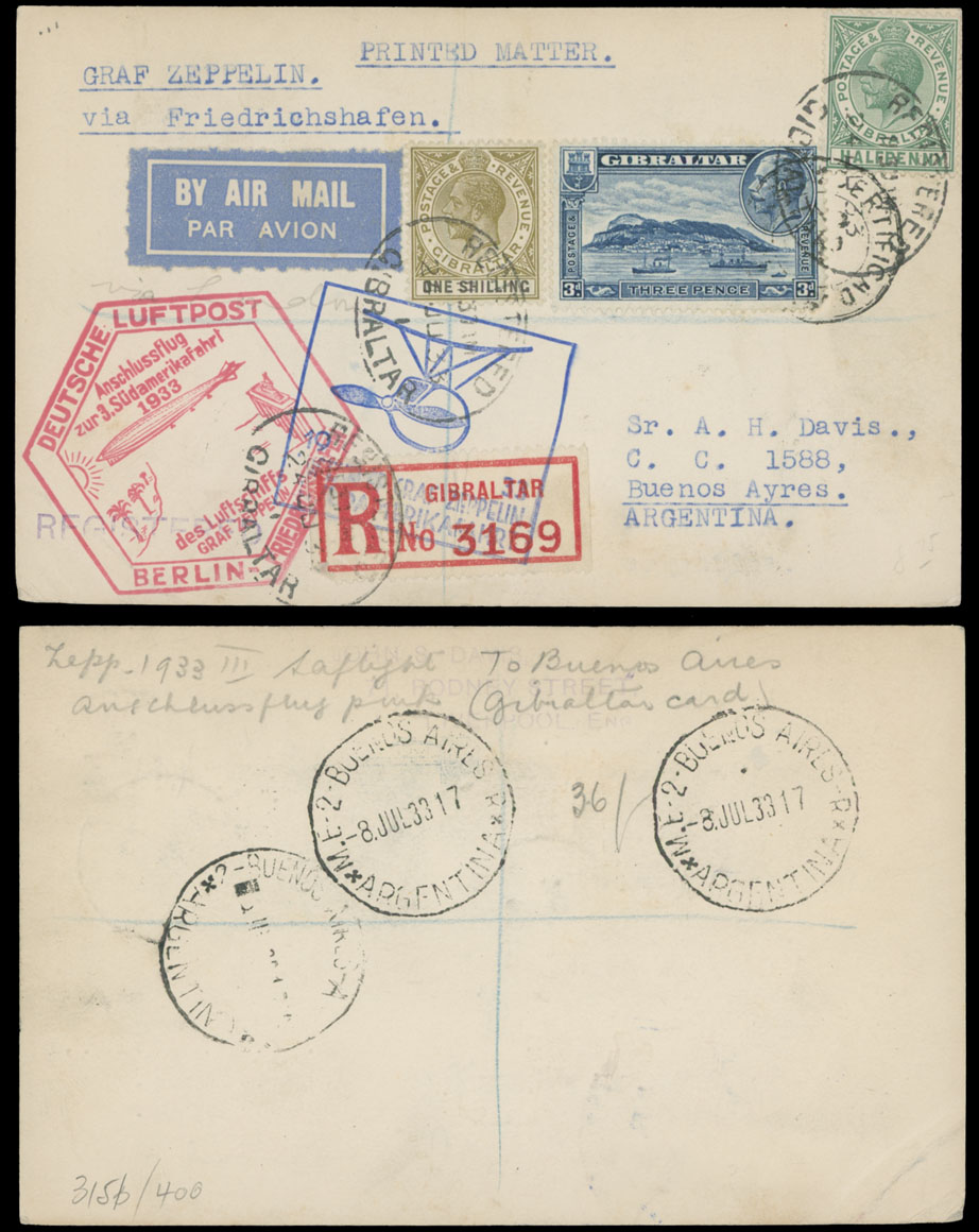 1933 (July 1-3), 3rd South America Flight registered postcard to Argentina, franked by three King George V values, tied by oval ”24.JU.1933” markings, red Berlin- Friedrichshafen connection and blue flight cachet, Buenos Aires arrival ds on reverse, F/VF, Sieger #219, C.v. €400, Est. $300-$350, Scott #76, 84, 99