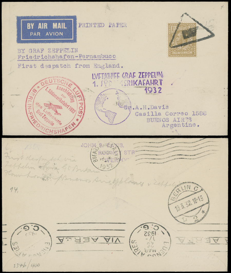 1932 (March 20-23), 1st South America Flight cover to Argentina, franked by King George V 1s bister, red Berlin-Friedrichshafen connection and violet flight cachet, Buenos Aires ”MAR.25.1932” arrival markings on reverse, mostly VF, Sieger #138, C.v. €500, Est. $300-$350, Scott #200