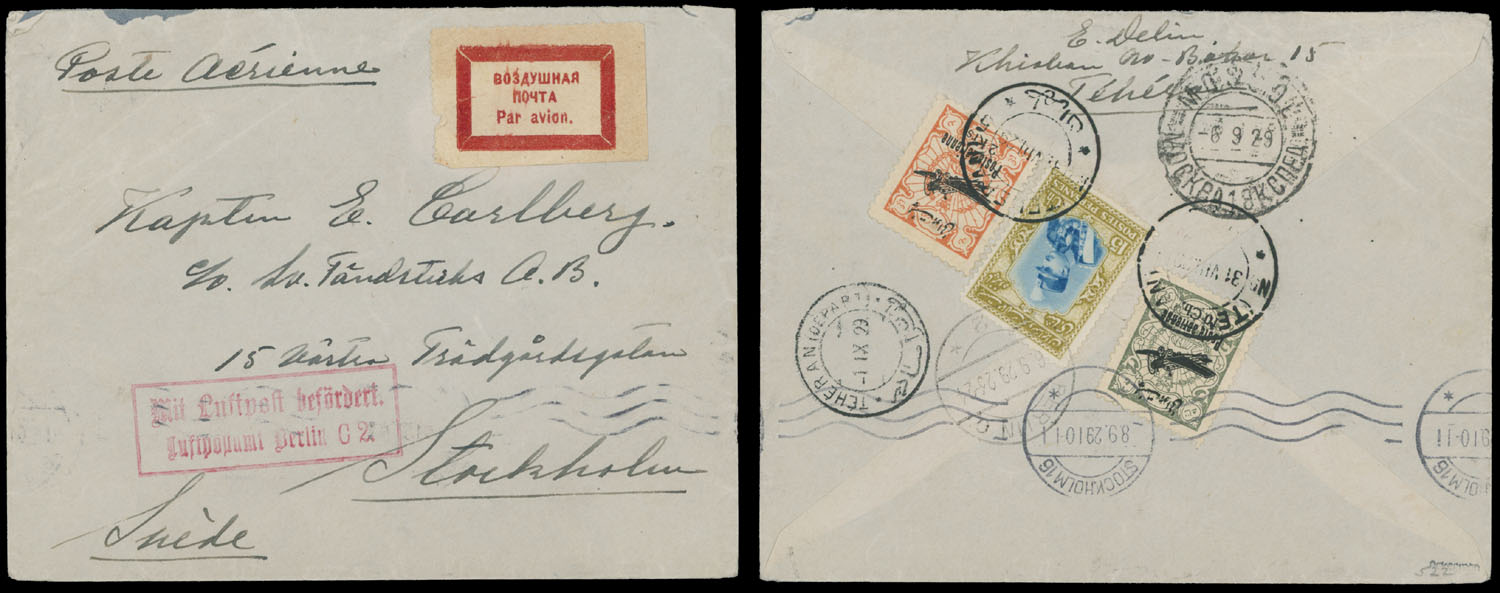 1929 (September 1-8), cover from Tehran to Stockholm, franked by three values, delivered by several Pioneer Connecting Flights, including Tehran – Moscow, Moscow – Berlin and Berlin – Stockholm, bearing transits of Moscow (6.9.29), Berlin (6.9.29) and machine Stockholm receiver of September 8, Soviet ”Air Mail” label and red Berlin connection marking on front, mostly VF and scarce well traveled item, Est. $300-$400, Scott #C26, C28