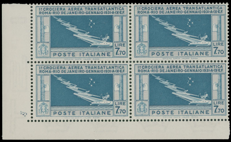1930, Trans-Atlantic Squadron, 7.70L deep blue and gray, bottom left corner sheet margin block of four, printer’s sign on selvage at lower left, perfectly centered and post office fresh, full OG, NH, VF and rare, each stamp has A. Bolaffi guarantee hs and signed by him in pencil, C.v. $3,600++, Sassone #PA25, C.v. €5,500, Est. $2,000-$2500, Scott #C27