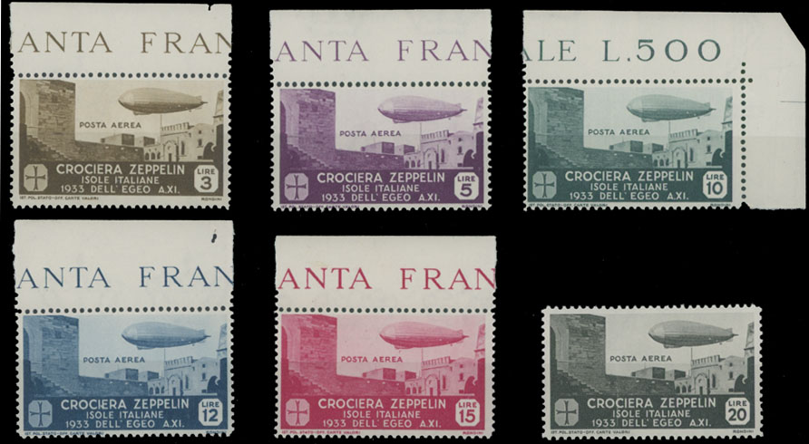 1933, Zeppelin issue, 3L-20L, complete set of six, 5 stamps with sheet margins, nice quality, full OG, NH, VF, C.v. $1,290, Sassone #PA22-27, C.v. €3,000, Est. $500-$600 , Scott #C20-25