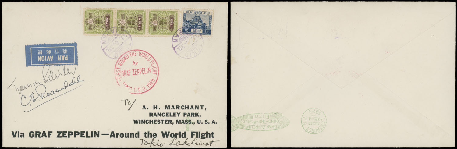 1929 (August 23-29), Around the World Flight cover to US, franked by four stamps, tied by Tokyo ”21.8.29” ds, red Japanese flight marking, signed by crew member (later captain of L.Z.130, Graf Zeppelin II) Hans von Schiller and Vice-Admiral of the US Navy Charles E. Rosendahl, who stayed on board of this flight, delivered on legs Tokyo-Los Angeles-Lakehurst, machine arrival is on reverse, VF, Sieger #31B, C.v. €800++, Est. $600-$700, Scott #137, 147 x3