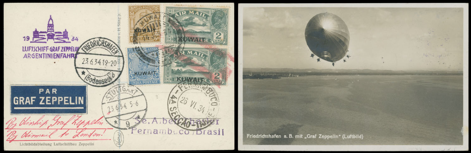 1934 (June 23-26), Argentina Flight to Pernambuco, franked by four stamps, tied by Kuwait 14.JUN.34 ds, Stuttgart and Friedrichshafen connection markings, violet Flight marking, Pernambuco ”26.VI.34” receiver, VF and rare, Sieger #254, C.v. €900, Est. $800-$900, Scott #C2