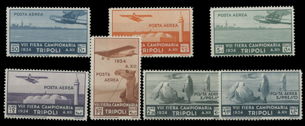 1934, 8th Tripoli International Fair, 50c – 25+3L, 2.25L and 4.50+1L, complete set of seven, air post and special delivery, full original bright gum, NH, VF, C.v. $1,325, Sassone #PA14-20, C.v. €3,100, Est. $500-$600 , Scott #C14-18, CE1-2