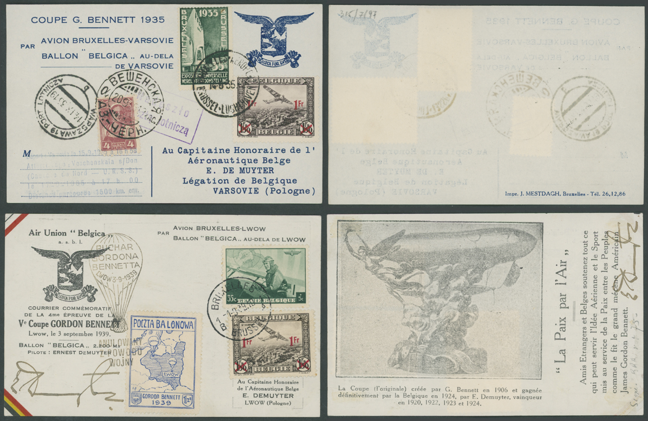 1935-39, two postcards originated from Belgium, each franked by two stamps, first one posted to the flight on September 15, 1935 with final destination in Soviet Union, uprated by definitive stamp of 4k claret and cancelled by village Veshenskaya ds; the other one – to the flight on September 3, 1939, which was cancelled because of the beginning of the WWII, uprated by Poczta Balonowa 1zl blue, mostly VF, Est. $300-$400
