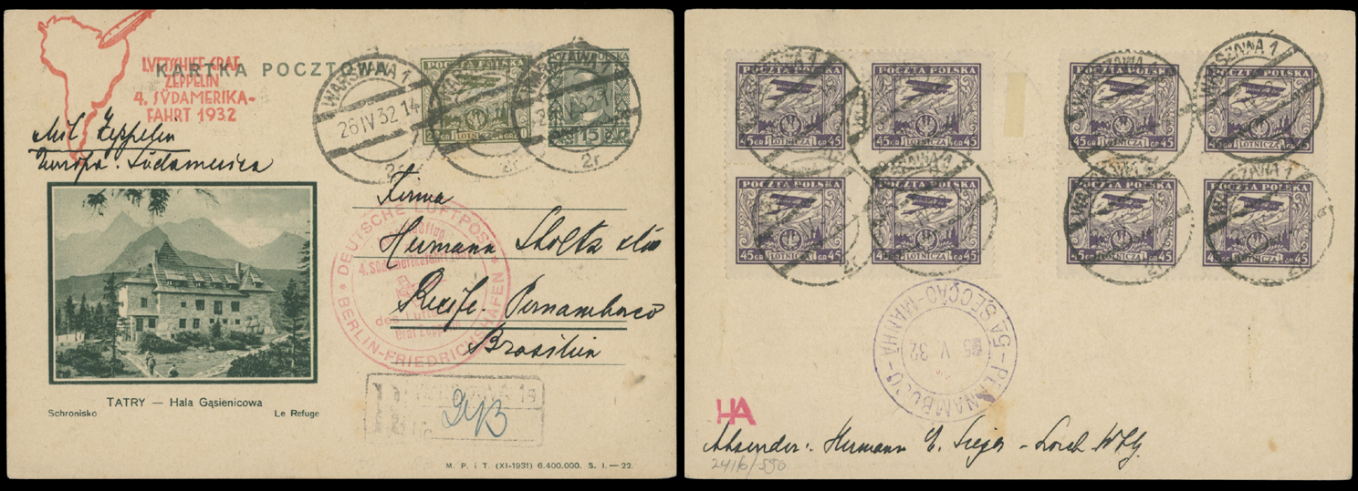 1932 (May 2-5), 4th South America Flight stationery registered postcard 15gr to Brazil, uprated by nine air post values (eight on reverse), tied by Warsaw ”26.IV.32” marking, red Berlin-Friedrichshafen connection and vermilion flight cachet, Pernambuco ”5.V.32” arrival hs on reverse, minor soiling, F/VF, Sieger #157, C.v. €700, Est. $400-$500, Scott #C7, C9 x8
