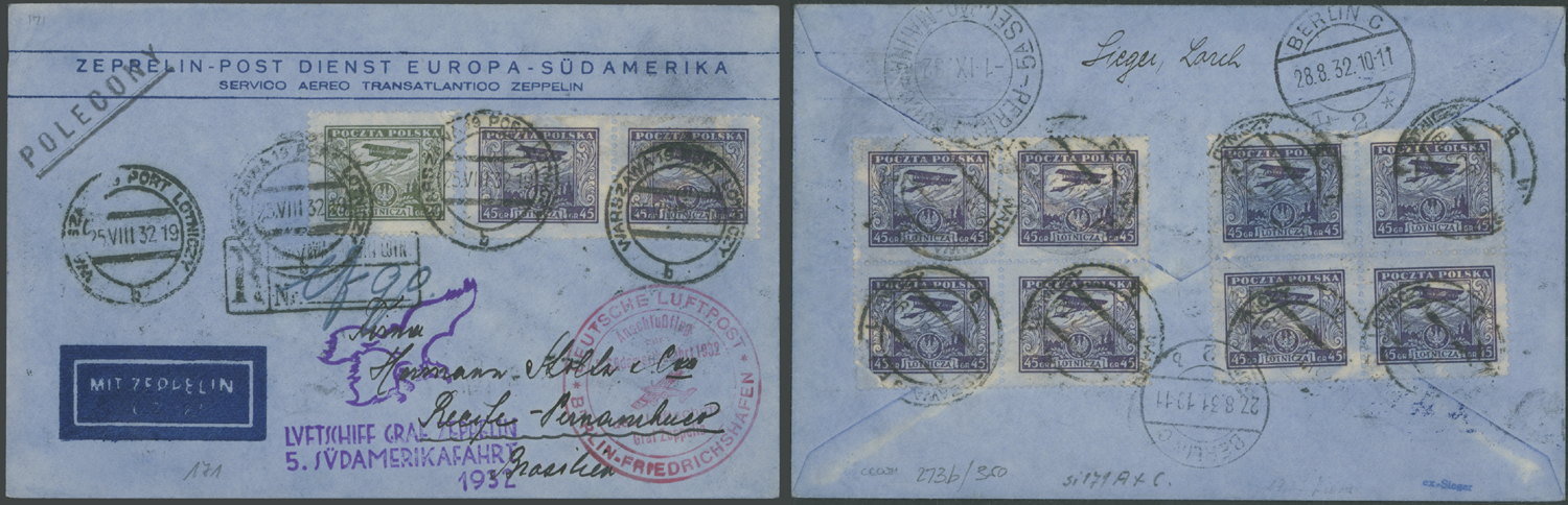 1932 (August 29-September 1), 5th South America Flight pre-printed registered cover to Brazil, franked by 11 air post values (eight on reverse), tied by Warsaw ”25.VIII.32” ds, red Berlin-Friedrichshafen connection and violet flight markings, Pernambuco arrival hs on reverse, blue envelope ink absorbed through stamp paper, still F/VF, Sieger #171, Est. $250-$300, Scott #C7, C9 x10