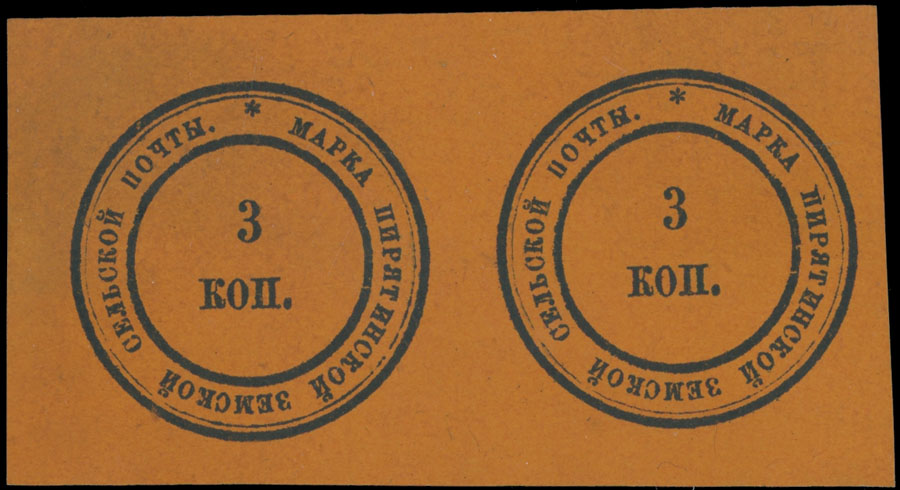1868, Numeral in Concentric Circles, 3k black on orange colored paper, horizontal pair showing slightly different printing details, no gum as produced, VF and rare pair, C.v. $2,000, Est. $1,000-$1,200 , Schmidt #1