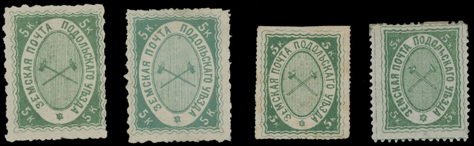 1870(c)-76, four stamps of 5k green in various shades, including No. 5 (C.v. $500), full OG or unused, no gum (No.3 and 4), F/VF, C.v. $980, Est. $500-$600 , Schmidt #2-5