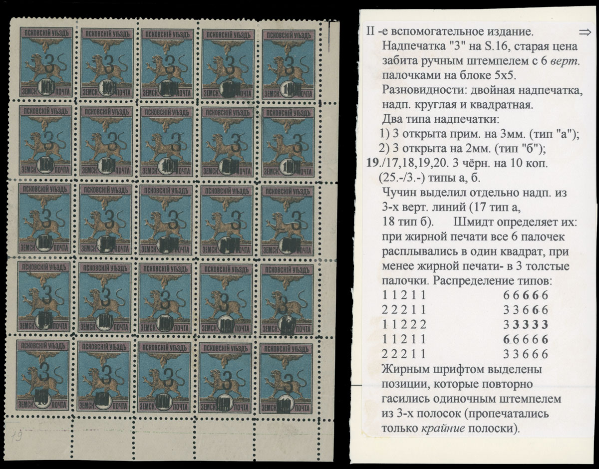 1894, black surcharge 3(k) on 10k black, brown, blue and lilac, pane of 25 with appropriate margins at right and bottom, representing two different types of obliterating by vertical bars with nine stamps bearing double obliteration, some perf re-enforcement, full OG, many NH, VF and very rare, ex- Kirchner, Faberge, detailed description (in Russian) is included, C.v. $9,300 as singles, Est. $5,000-$6,000, Schmidt #19 var