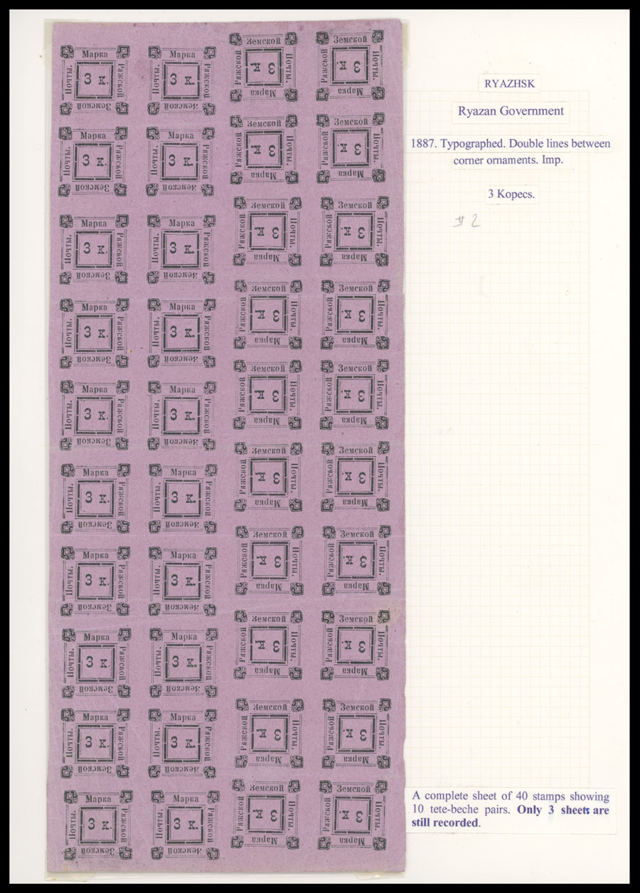 1887, Numeral in Square, 3k black on lilac paper, complete sheet of 40, right part is inverted and forming ten horizontal tete-beche pairs, several folds mostly between stamps and a thin spot affecting one tete-beche pair, full OG with many NH stamps, F/VF and very rare, only three complete sheets reported, ex-Bianchi, C.v. $8,800 as ten tete-beche pairs and 20 single stamps, Est. $5,000-$6,000, Schmidt #2, 2S