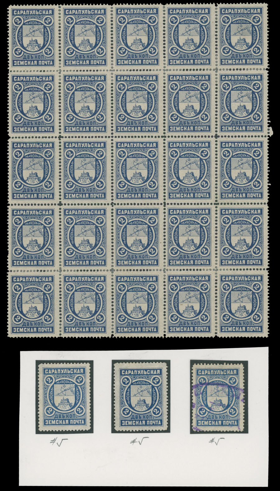 1893, 2k blue, pane of 25 (no margins) and three singles (one with a part of zemstvo cancellation), several stamps in pane with broken ”2” at the bottom left corner, full/large part of OG, many NH stamps, F/VF, C.v. $1,400, Est. $400-$450, Schmidt #5