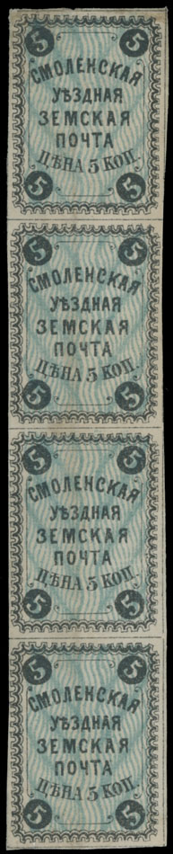 1894, Ornamental Rectangle, 5k black and light greenish blue, vertical strip of four, vertical ironed fold, otherwise eye-catching item, unused, no gum, VF appearance of this rare multiple, ex-Faberge, C.v. $1,200, Est. $800-$900 , Schmidt #1