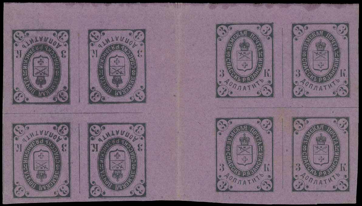 1884, Arms inside Oval in Rectangle, 3k black printed on rose lilac paper, vertical gutter block of eight (4×2), bearing two horizontal tete-beche pairs with gutter in the middle, vertical fold along the gutter, full original yellowish gum with some unevenness, F/VF and rare multiple, C.v. $1,760, Est. $1,000-$1,200, Schmidt #5S