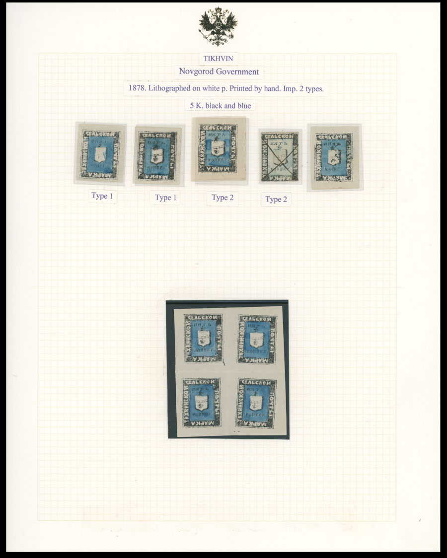 1878-79, Arms in Rectangle, litho printing with water-color drawn, 9 stamps (8 – unused and 1 – pen cross cancelled No.17), arranged on page from the Bianchi collection, five singles and one block of four (No.15), types 1 and 2 of No.13, full/part of OG, F/VF, C.v. $1,350, Est. $800-$900, Schmidt #13, 15, 17