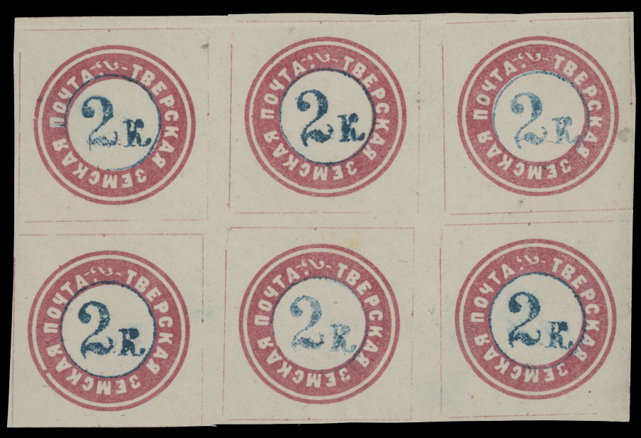 1871, Handstamped value 2k in light blue or dark blue inside litho printed circles in rose, block of six (3×2), full OG, NH or previously hinged, VF, C.v. $1,200, Est. $800-$900 , Schmidt #3-4