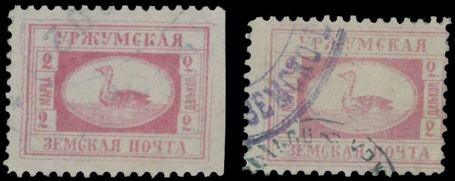 1899, two thin lines inside oval, 2k rose, two singles, first one cancelled by violet oval volost cancellation (straight edge at right), the other one bearing a part of volost marking and small zemstvo circular ds in black, mostly VF, the last one – ex-Faberge, used stamps have rank ”R” in Schmidt, C.v. $1,000, Est. $600-$700, Schmidt #6