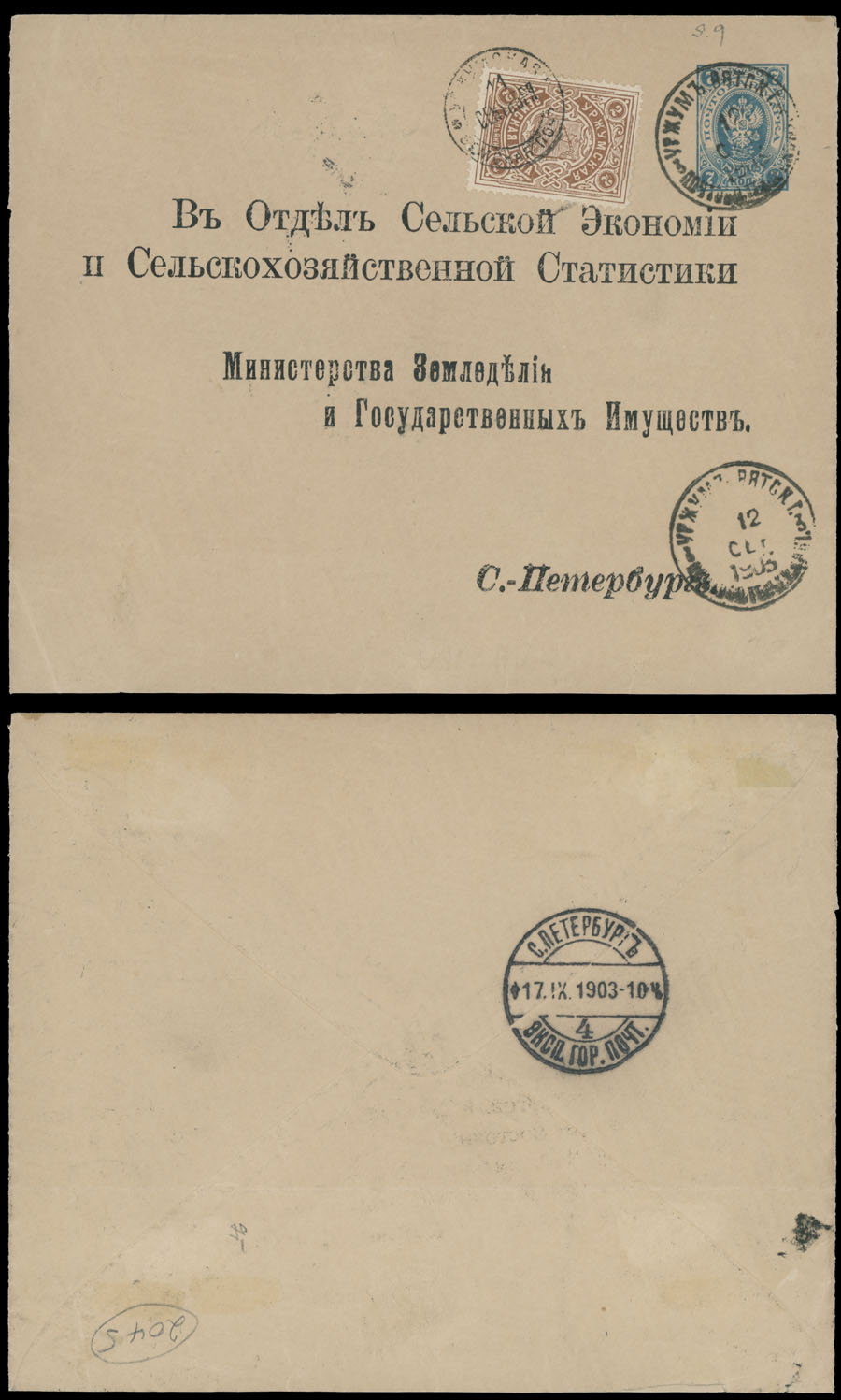 1903 (11 September), postal stationery envelope 7k blue, pre-printed address of the Department of Rural Economics and Agrarian Statistics – Ministry of Agriculture and State Property in St. Petersburg, uprated by 2kred brown, tied by zemstvo postmark, upon arrival to Urzhum cancelled by Imperial Post ds, St. Petersburg receiver is on reverse, F/VF, ex-Liphschutz, Est. $400-$500, Schmidt #9