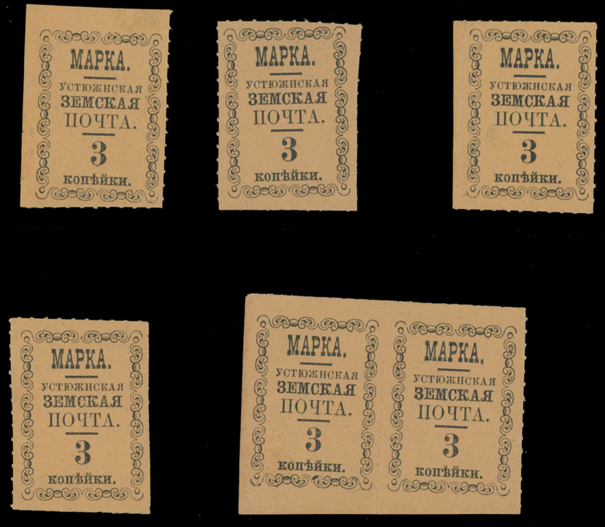 1891-92, Wide Curls, 3k black on orange paper, rouletted, four singles of types 1-4 and horizontal pair (types 5-6), large part of OG, F/VF, C.v. $300++, Est. $300-$350 , Schmidt #5-6