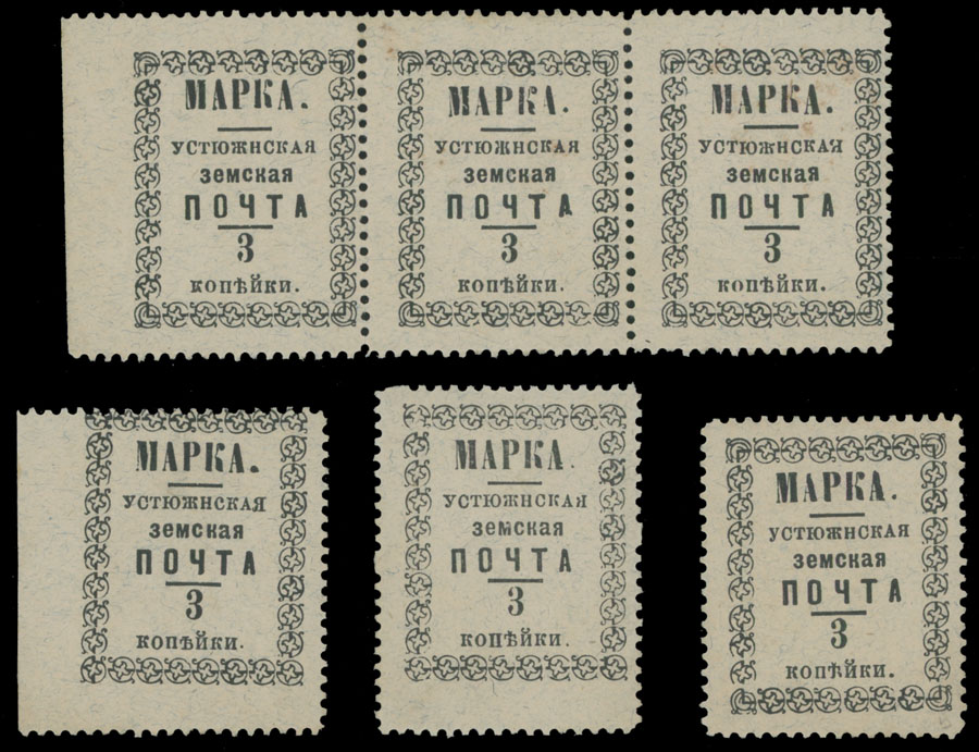1897, Curls with Diametric Line inside, 3k black on gray granite paper, strip of three (types 1-3) and three singles of types 4, 5, 6, large part of uneven original gum, F/VF, C.v. $150++, Est. $120-$150 , Schmidt #22