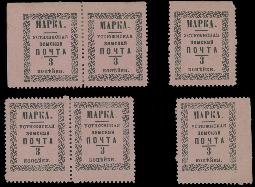 1897, Curls with Diametric Line inside, 3k black on lilac rose paper, two horizontal pairs of types 1-2 and 4-5, two singles of types 3 and 6, part of uneven original gum, F/VF, C.v. $150++, Est. $120-$150 , Schmidt #24