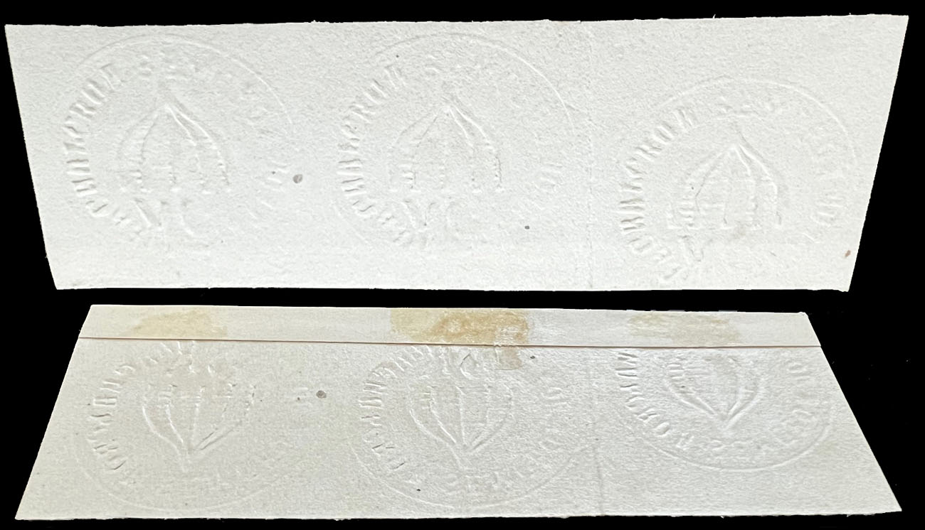 1871, 5k on white paper, horizontal strip of five, natural paper inclusion, no gum as issued, VF and scarce multiple, ex-Faberge, C.v. $1,200++, Est. $800-$900 , Schmidt #1