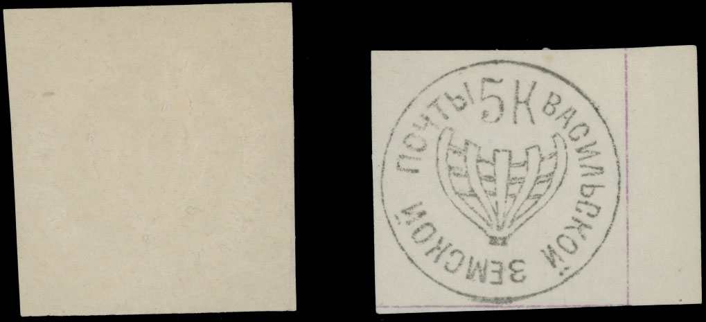 1871-78, 5k on creamy paper, and black Handstamp 5k with pen divided lines, no gum as issued, VF, ex-Faberge, C.v. $600, Est. $300-$350 , Schmidt #2, 3