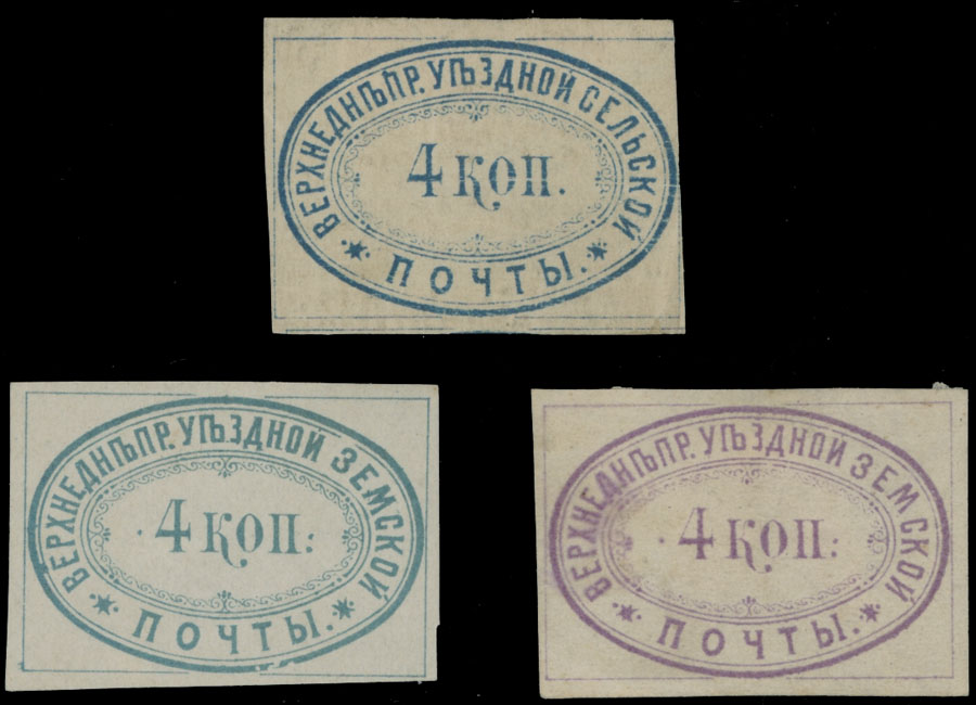 1873-76, Numeral in Double Oval, 4k blue inscribed ”Selskoy”, 4k sky blue and 4k violet, both with no embossing, inscribed ”Zemskoy”, part of OG, F/VF, ex- Bianchi, C.v. $390, Est. $300-$350 , Schmidt #8, 10-11