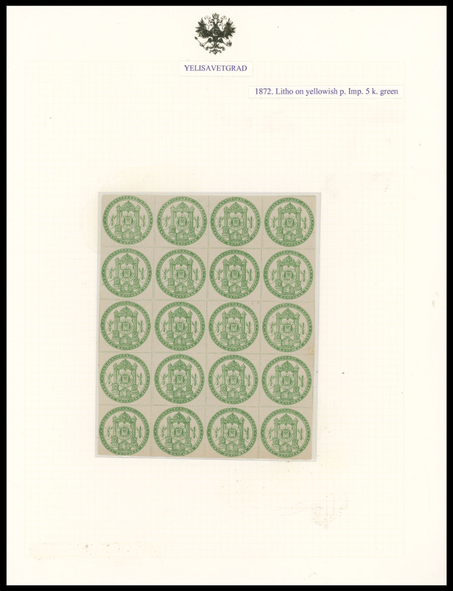 1872, 5k green, block of 20 (4×5), 1st issue, arranged on a page from the Bianchi collection, positions 9-12, 13-16, 17-20, 21-24, 25 -28, right stamp of the 2nd row with white spot at lower right corner of Arms, full OG, mainly NH, VF, C.v. $1,000++, Est. $600-$750, Schmidt #2