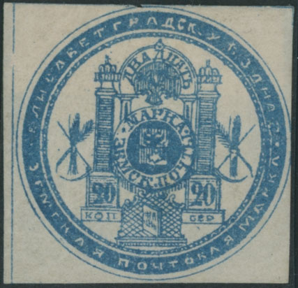 1876, 20k blue, a single printed on white wove paper, margin at right touched outer circle, repaired nick at top. large part of OG, VF and very rare, rank ”RRR”, only 7 stamps reported, C.v. $6,000, Est. $4,000-$5,000 , Schmidt #11
