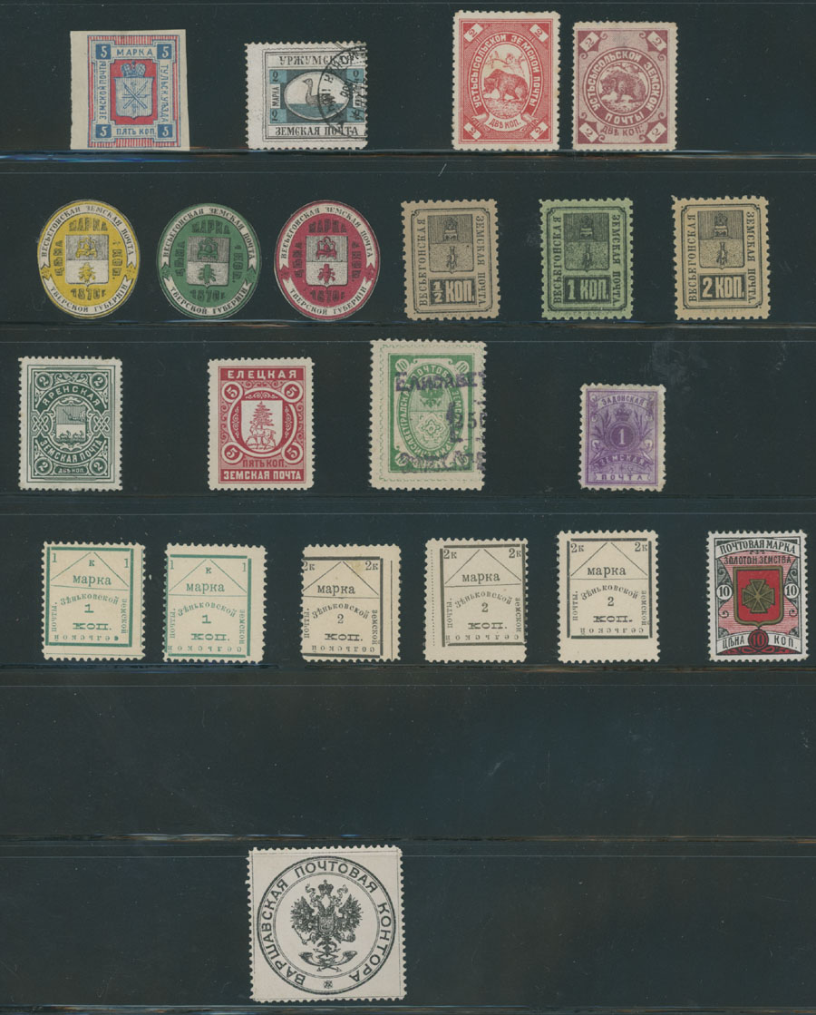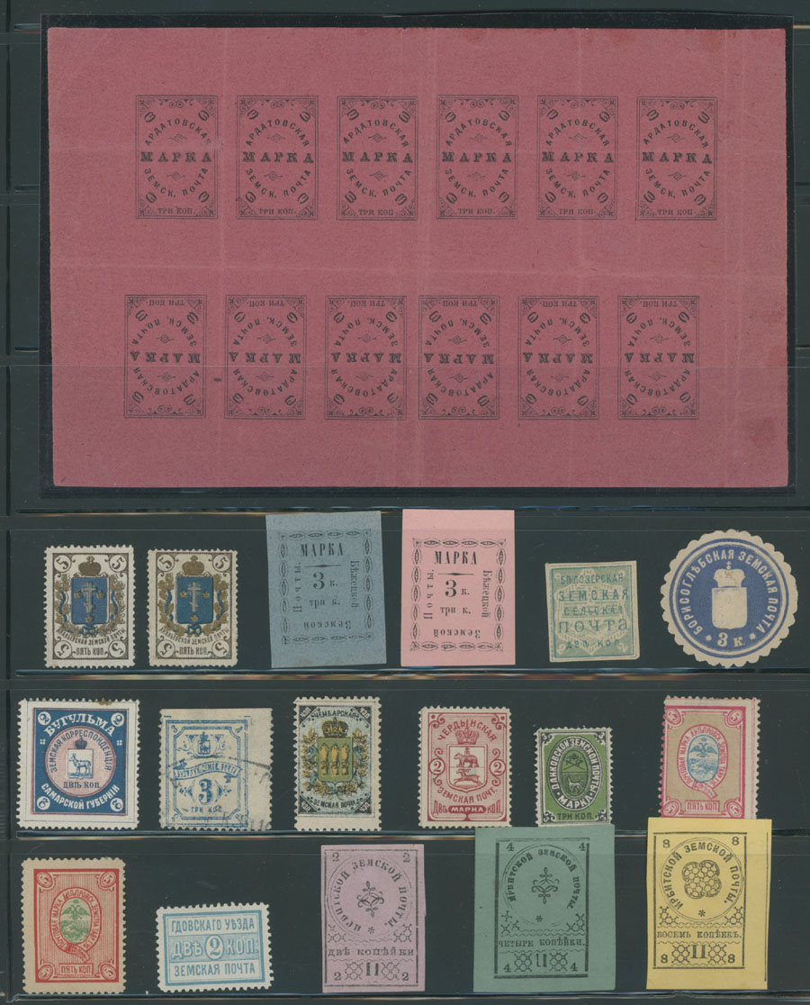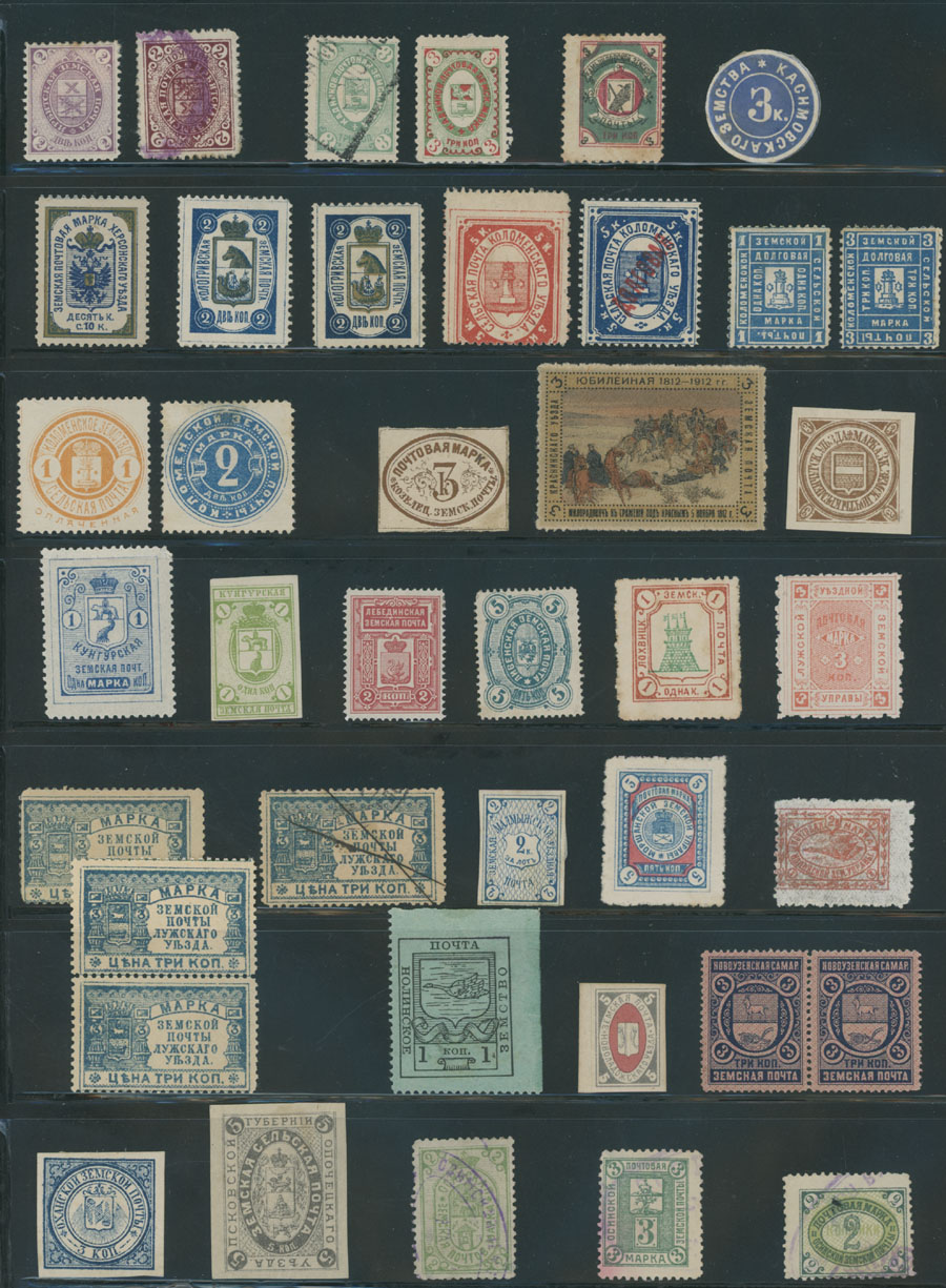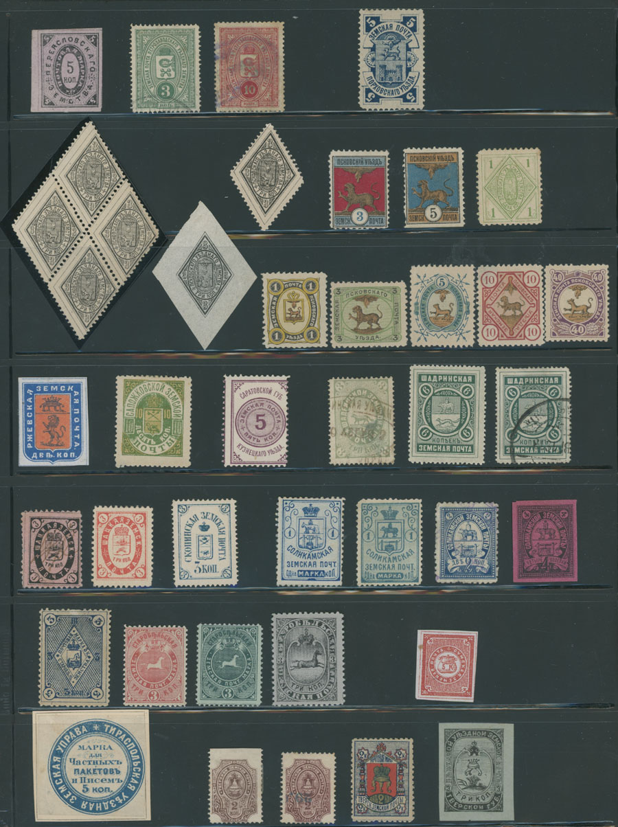 1868-1917, 131 mostly mint stamps (10 – used), representing issues of 59 different districts, starting with complete sheet of Ardatov No.29, containing 6 tete-beche pairs and finishing with Zolotonosha 10k multicolored, most powerful presentation from Irbit, Kolomna, Osa, Pskov and Starobyelsk, nice looking unit overall with possible faults, part OG/unused or used, F/VF, C.v. is over $4,300, Est. $1,000-$1,500