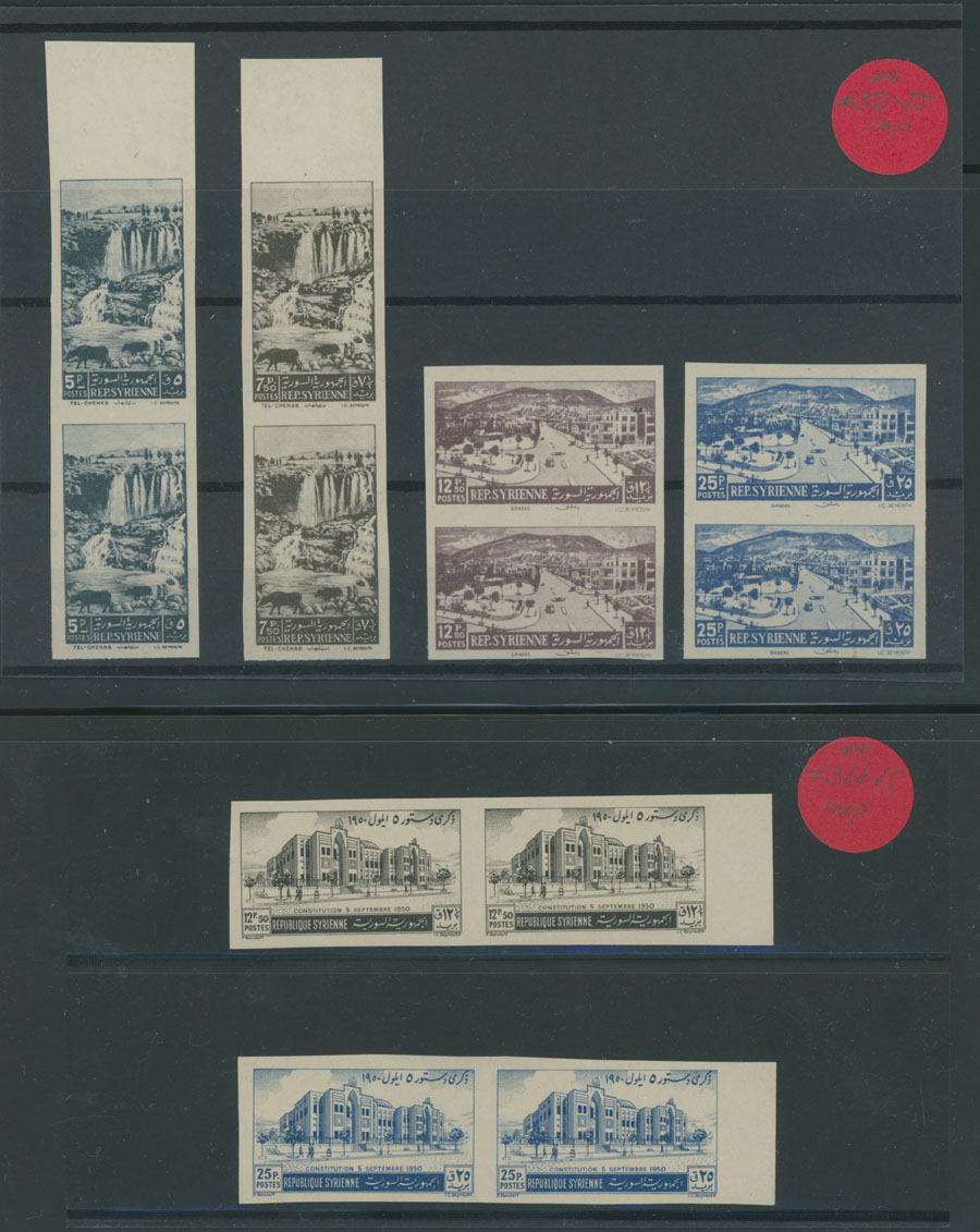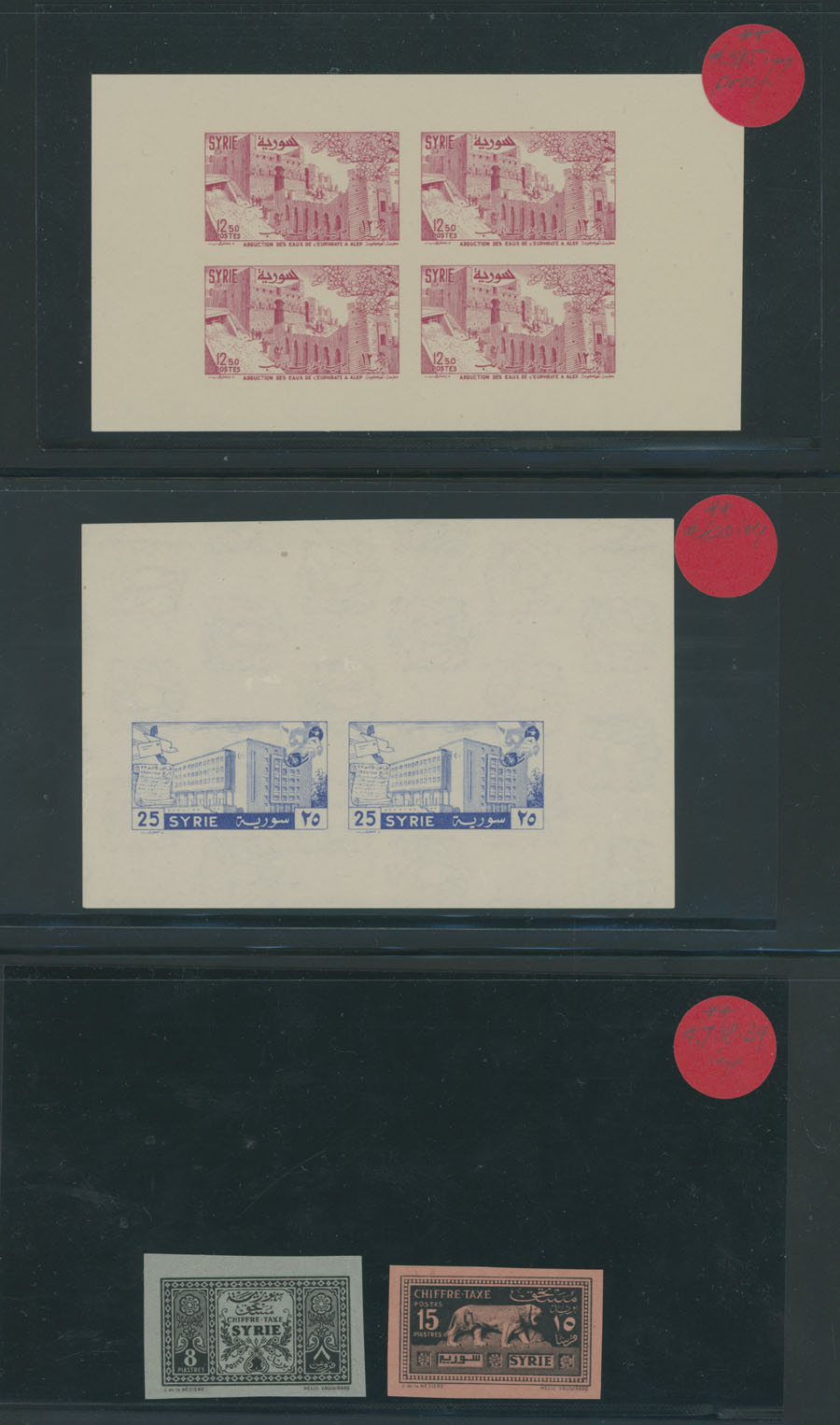GROUP OF PROOFS AND IMPERFORATES: 1931-58, Waterfall and view of Damascus, Parliament Building and Postage dues of 1931, in addition proofs of Aleppo Aqueduct and Communications Building, all with full OG, NH, VF, Est. $400-$500 , Scott #352/420, J37-38 imp