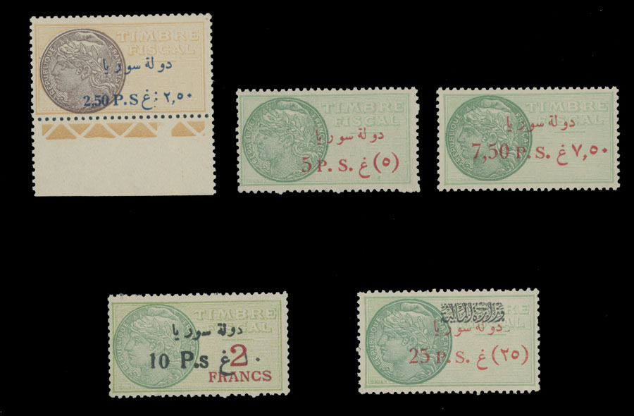 1923-25, black or red surcharges on French Timbre Fiscal, 2.50p-7.50p, 10p on 2fr and 25p, set of five values, full OG (10p/2fr – dried gum with tiny pen markings), NH, VF and rare in unused condition, Est. $300-$350
