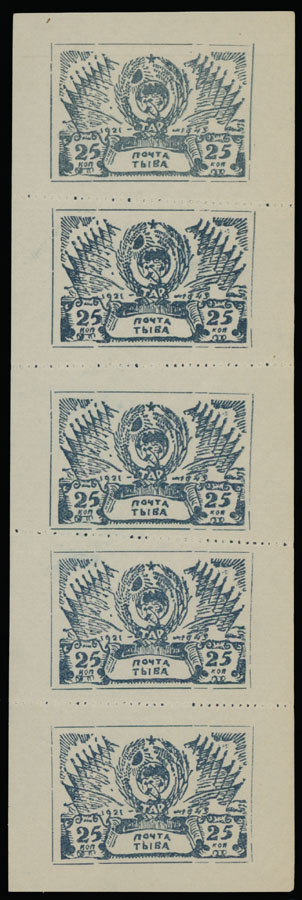 1943, Coat of Arms, 25k slate blue, vertical strip of five (complete setting) on white paper, no gum as issued, NH, VF, C.v. $500, Est. $250-$300 , Scott #120b