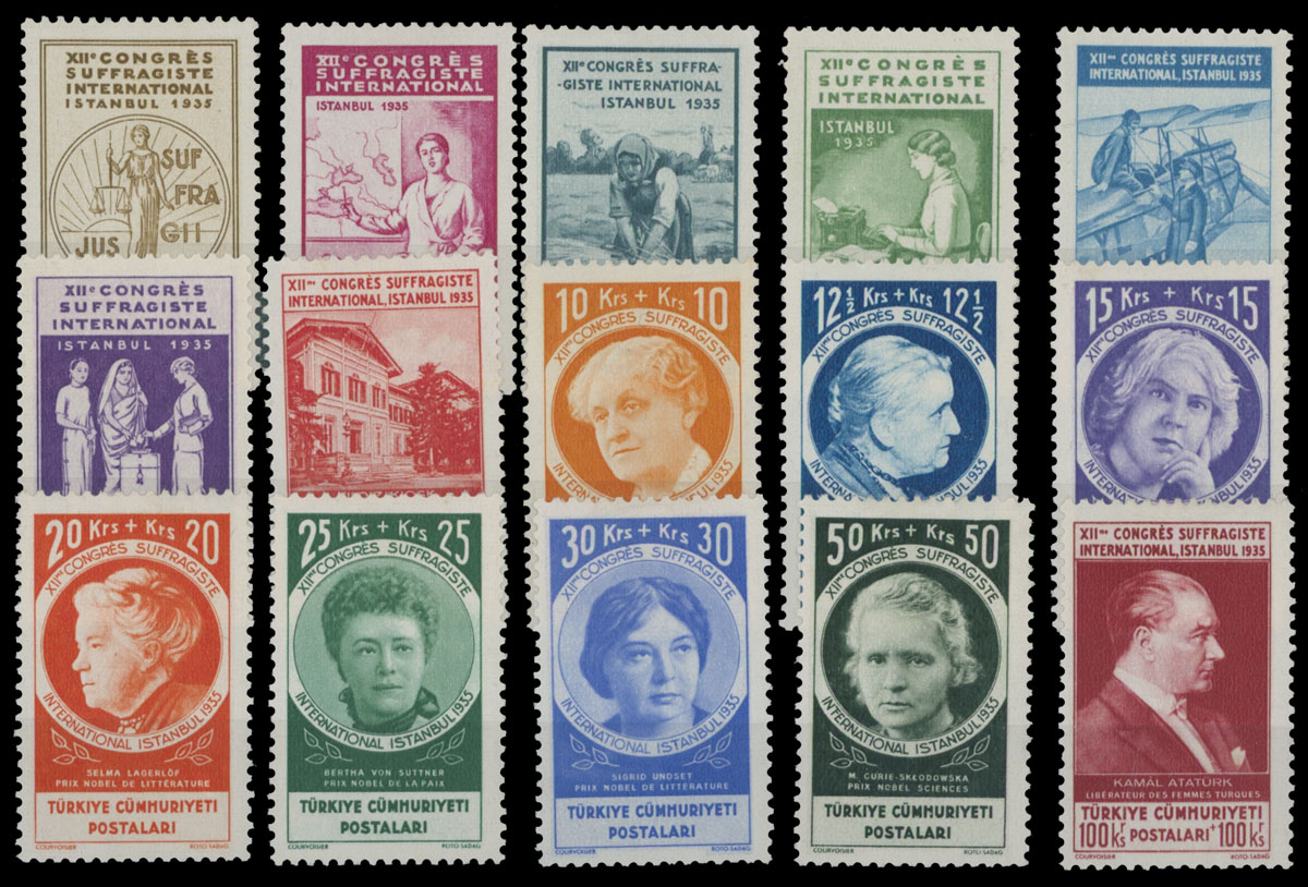 1935, Suffragists’ Congress, 20pa +20pa – 100k+100k, complete set of 15, full OG, NH, VF, C.v. $750, Est. $300-$350 , Scott #B54-68