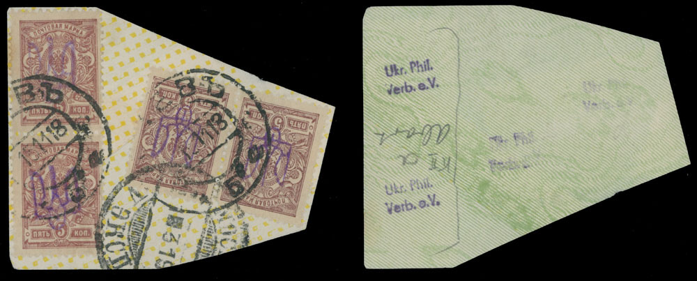 1918, violet overprint on perforated 5k claret, vertical pair cancelled on a piece together with horizontal pair of 5k bearing Kyiv type 2 overprint, VF, five stamps of this type recorded, and the only pair in existence, illustrated in the Dr. Ceresa Monograph, expertized by U.P.V., Est. $1,500-$2,000, Bulat #2390
