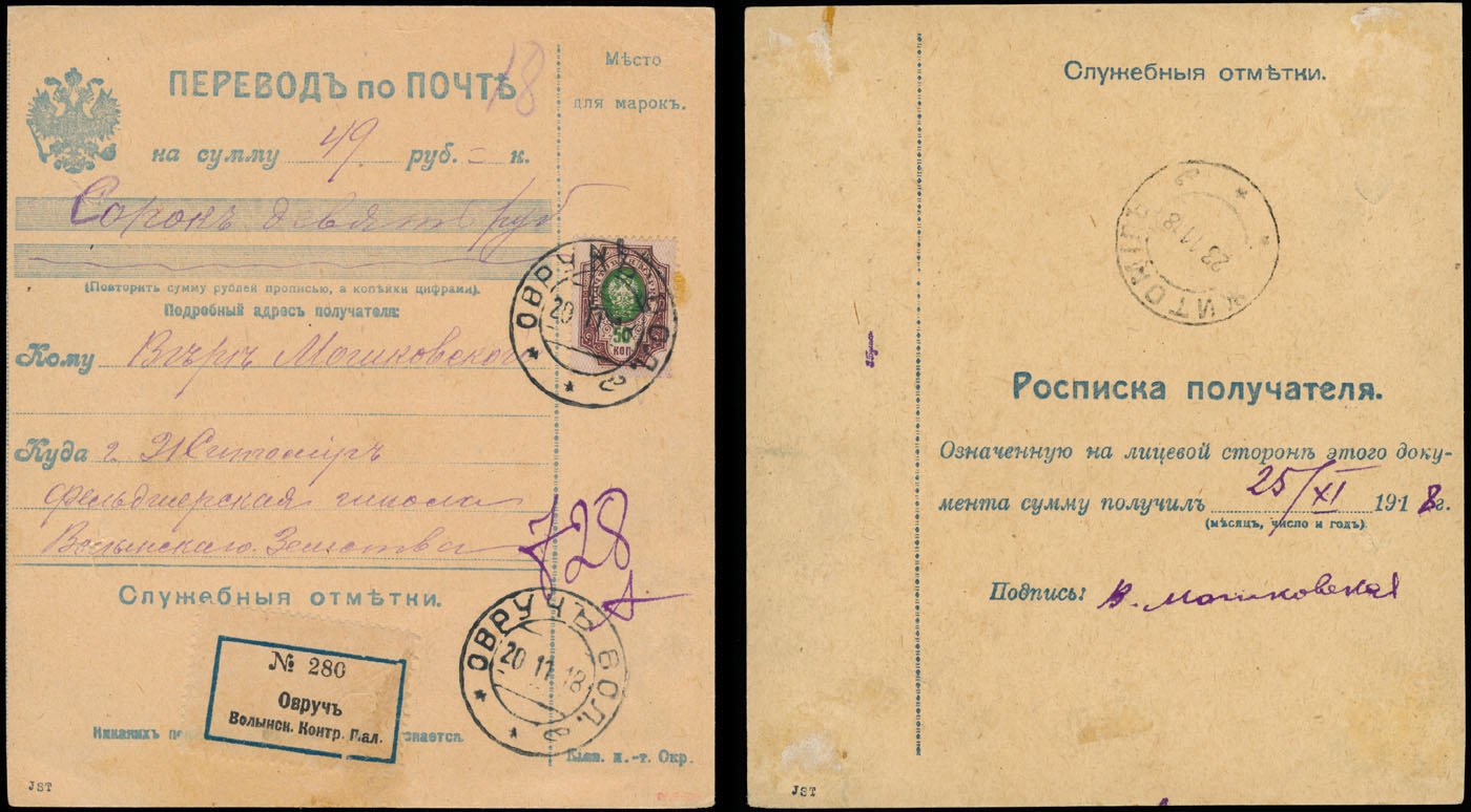 1918, black overprint on 50k violet and green, used on money order for 49rub from Ovruch to Zhytomyr, all appropriate markings, VF and rare, expertized by Dr. Jemtschoujin, ex-J. Terlecky, C.v. $55 for the stamp off cover, Est. $300-$350 , Bulat #2465