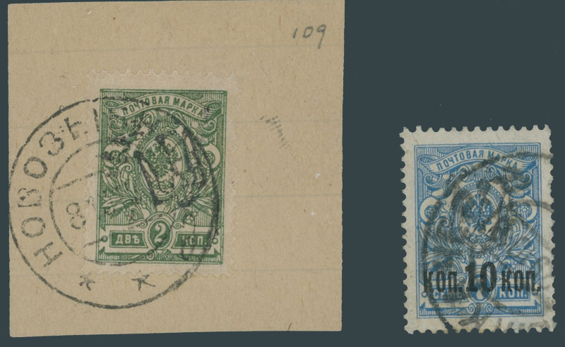 1918, black overprint on perforated 2k green and over black surcharge 10k on 7k light blue, both are postally used, first one – on a piece, VF, expertized by O. Peters and Dr. Seichter, C.v. $240, Est. $200-$250 , Bulat #2512-13