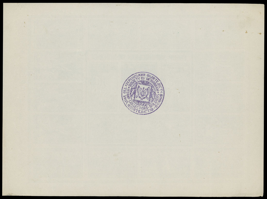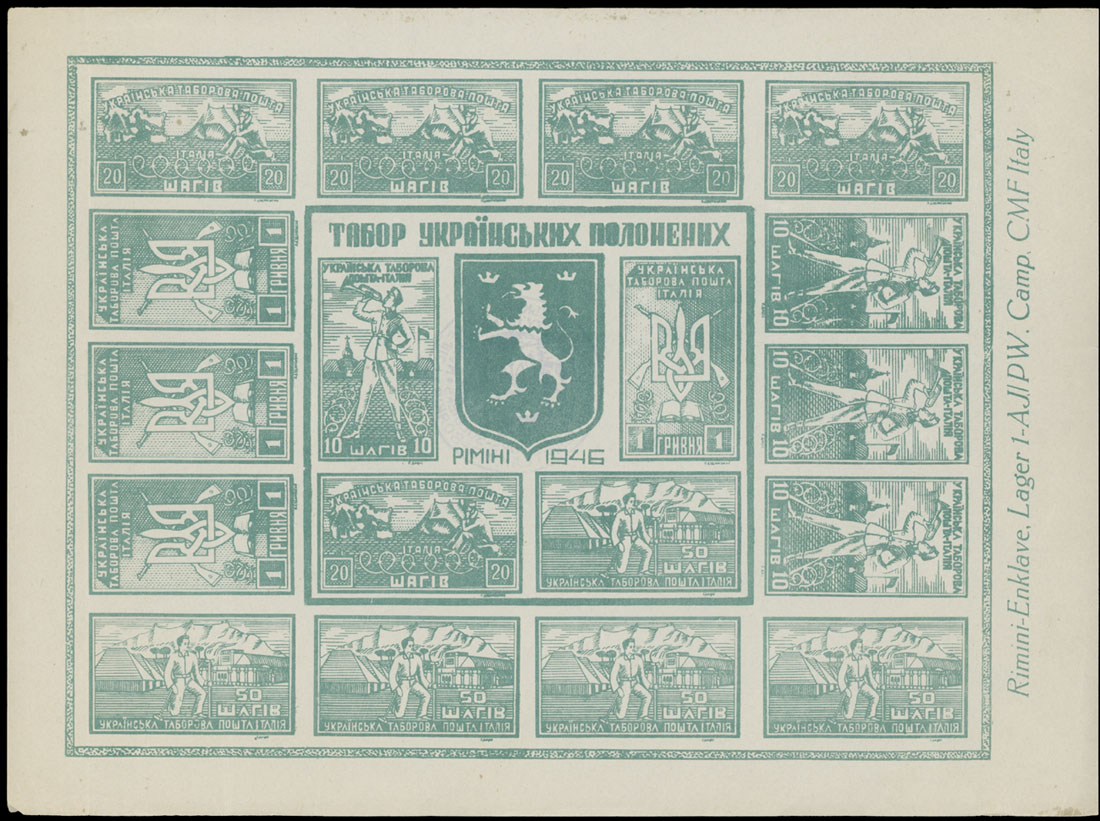 1946-47, large size se-tenant souvenir sheet and 14 stamps, each one inscribed ”Ukrainian Camp Post”, minor usual bends did not detract, fresh quality overall, no gum as produced, VF, Ukrainian Society of Soldiers-Collectors seal on reverse, Est. $300-$400, Scott #1-4, var