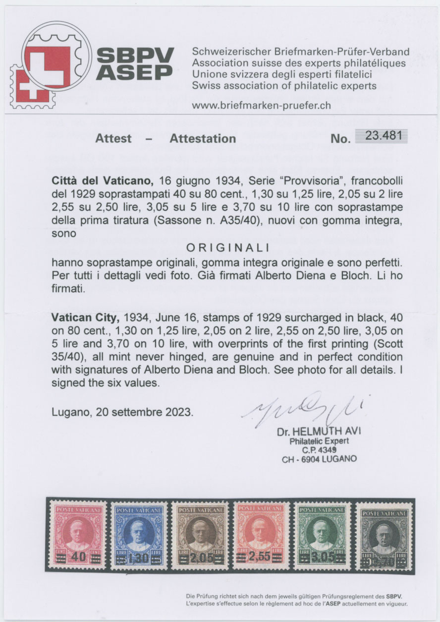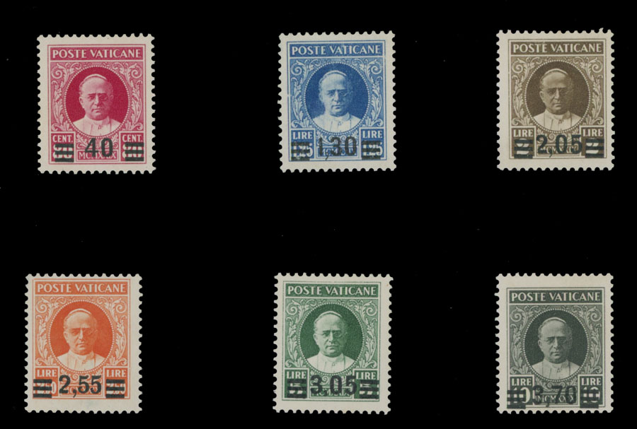 1934, Pope Pius XI, black surcharges 40c/80c – 3.70L/10L, complete set of six, the first printing, full OG, NH, VF, each stamp signed H. Bloch, Dr. H. Avi certificate for the set, C.v. $2,900, Sassone #35-40, C.v. €4,000, Est. $1,000-$1,200 , Scott #35-40