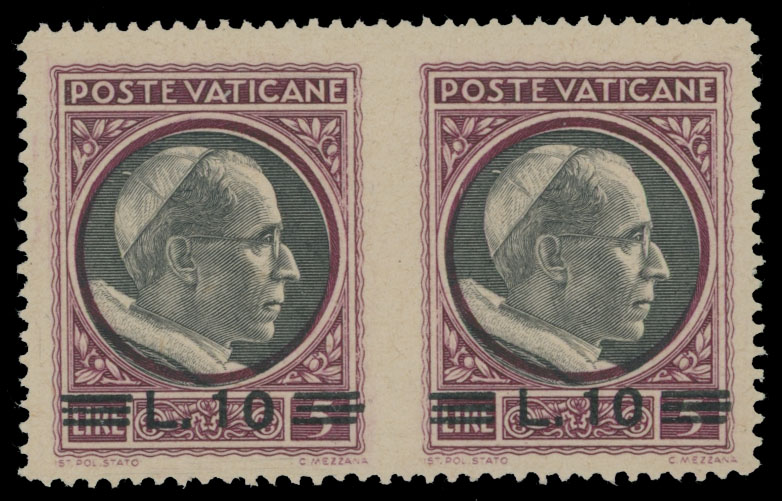 1945, Pope Pius XII, black surcharge 10L on 5L lilac and black, horizontal pair imperforate between stamps, full OG, VLH, VF, Sassone #108r, C.v. €1,000 as never hinged, Est. $150-$180 , Scott #108 var