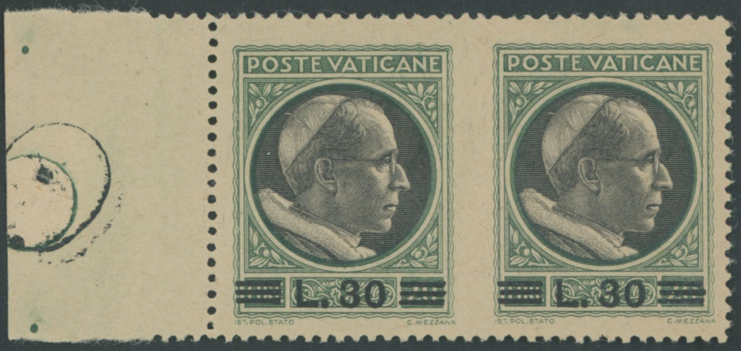 1945, Pope Pius XII, black surcharge 30L on 20L green and black, left sheet margin horizontal pair imperforate between stamps, full OG, NH, VF, Sassone #108r, C.v. €1,000, Est. $200-$250 , Scott #109 var