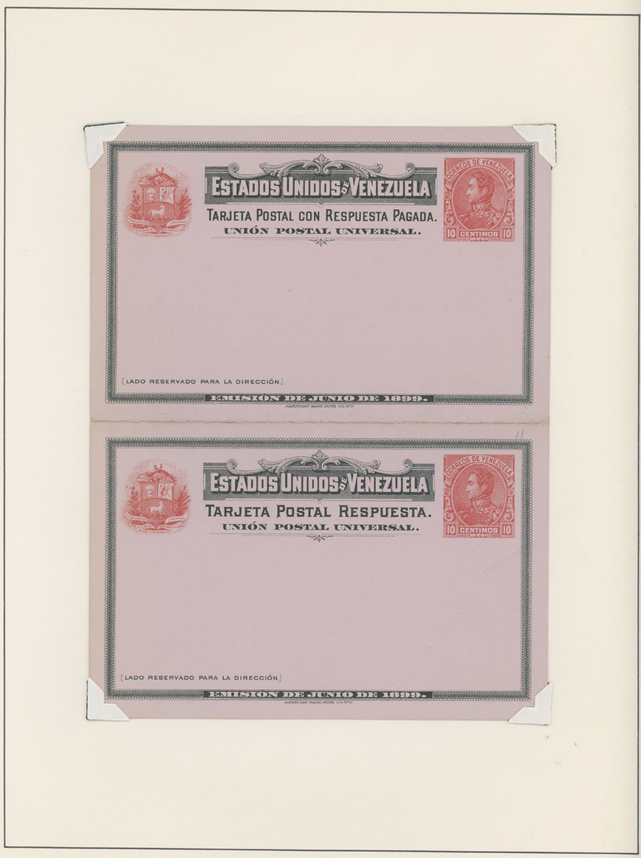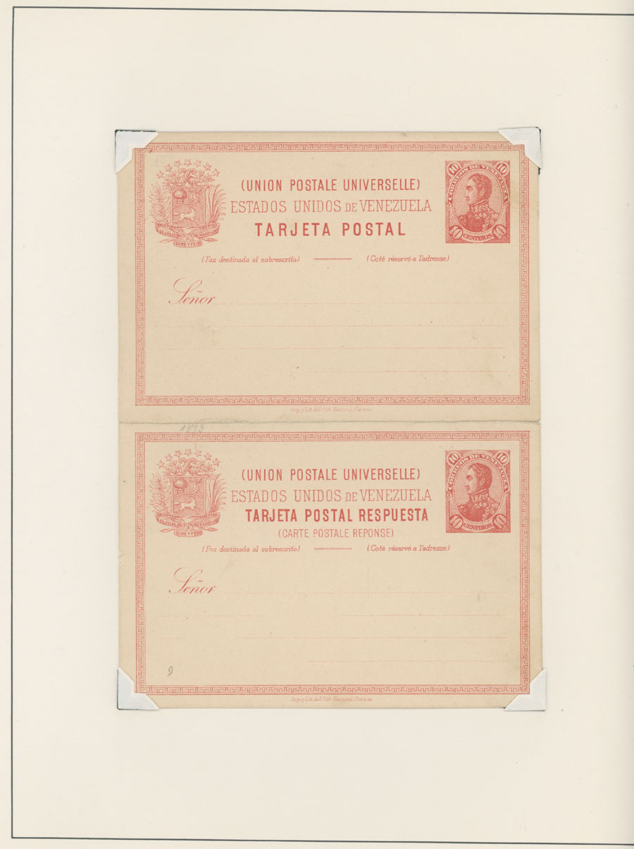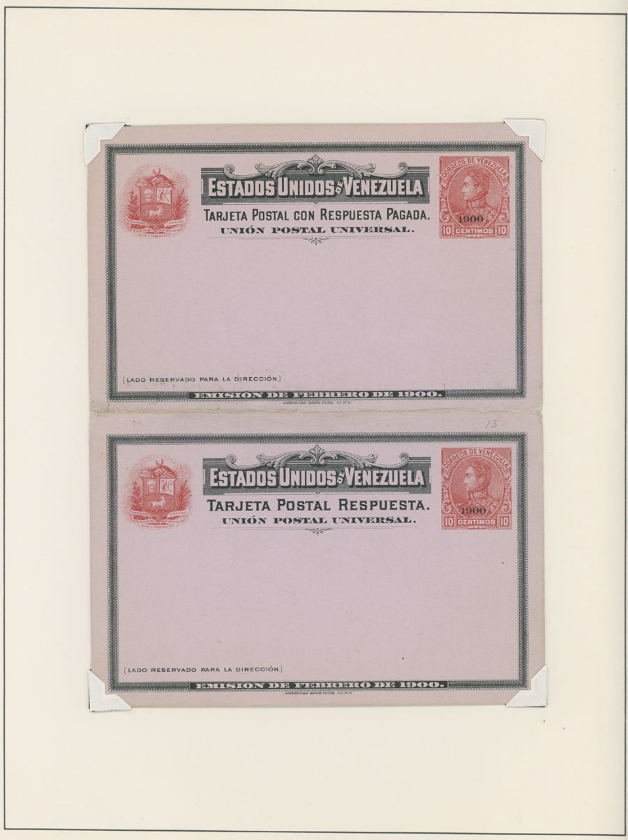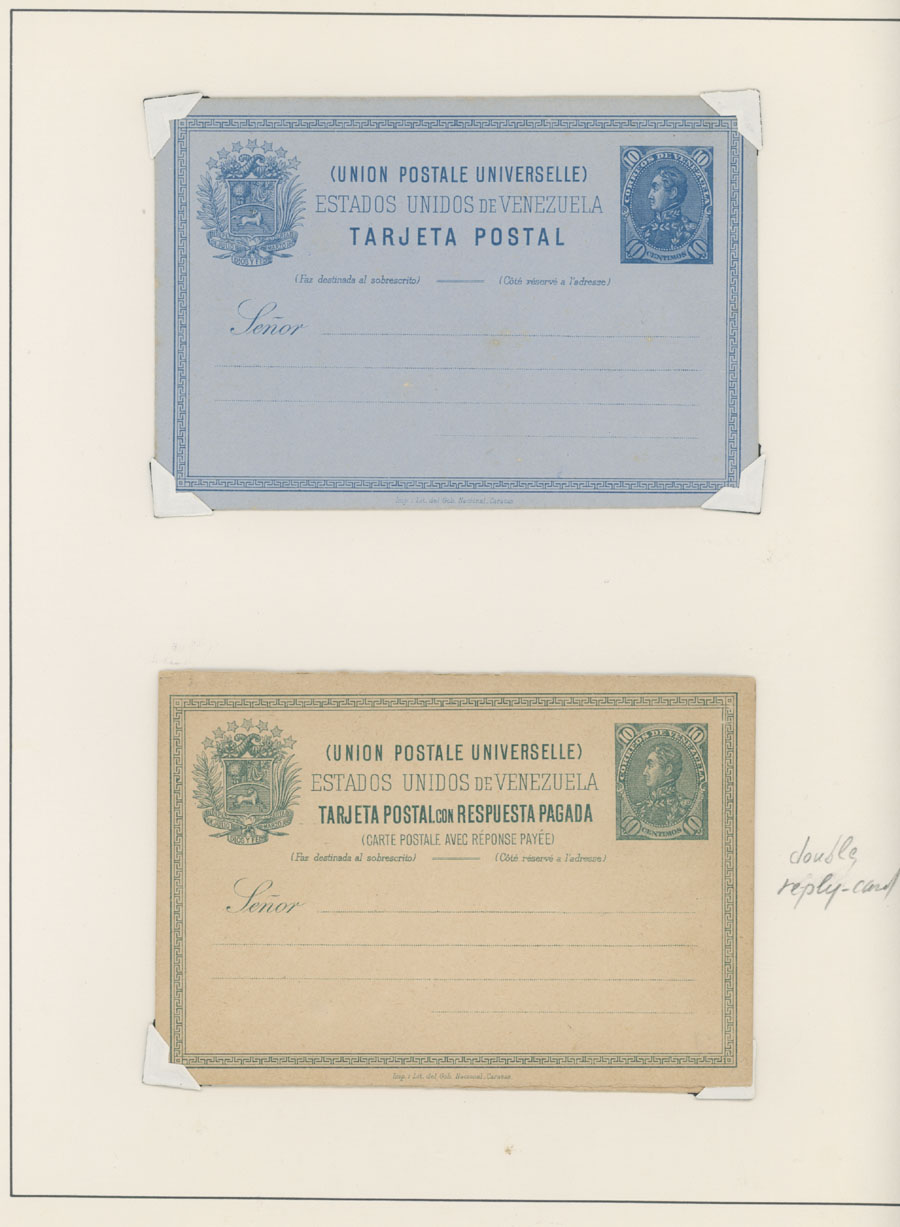 CLASSIC POSTAL STATIONERY UNIT: 1890-1911, 15 items, one used (to Germany) and 14 unused, representing 10 postcards, including one with Bolivar 10c blue on blue paper (unused) and one – card form without pre-printed indicia, as well as 5 reply pre-paid cards (all unused), neatly arranged on pages from a native collection, fresh and VF unit, Est. $200-$250