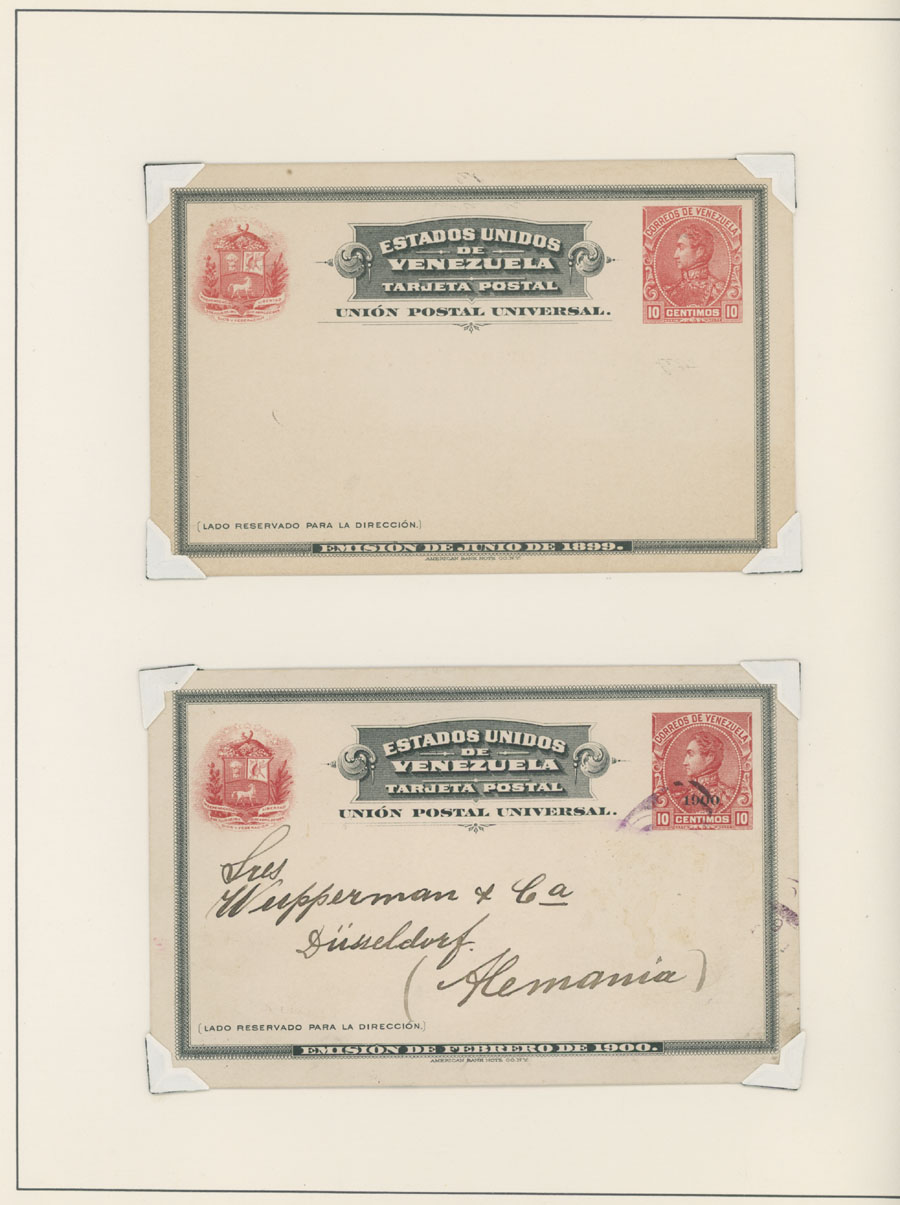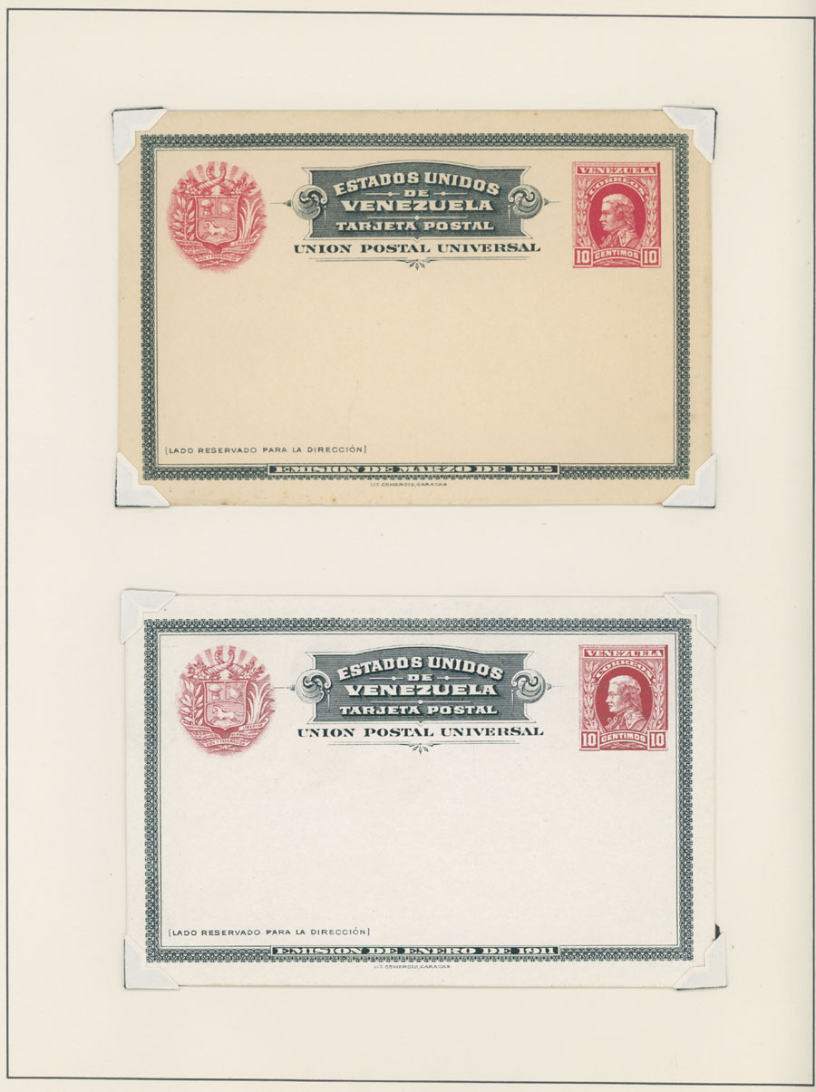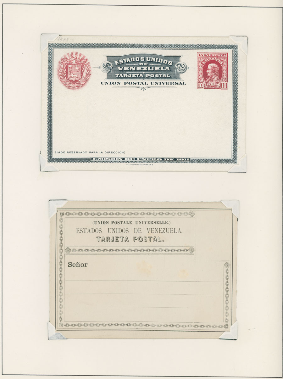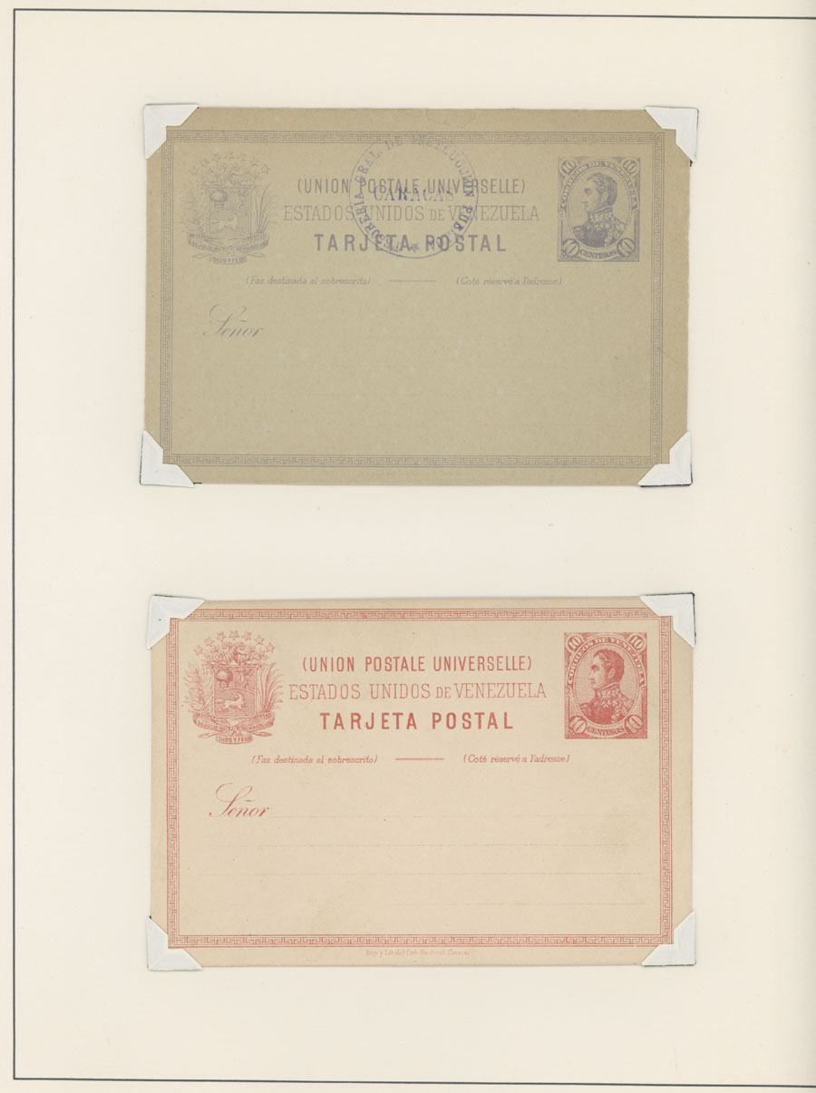 CLASSIC POSTAL STATIONERY UNIT: 1890-1911, 15 items, one used (to Germany) and 14 unused, representing 10 postcards, including one with Bolivar 10c blue on blue paper (unused) and one – card form without pre-printed indicia, as well as 5 reply pre-paid cards (all unused), neatly arranged on pages from a native collection, fresh and VF unit, Est. $200-$250