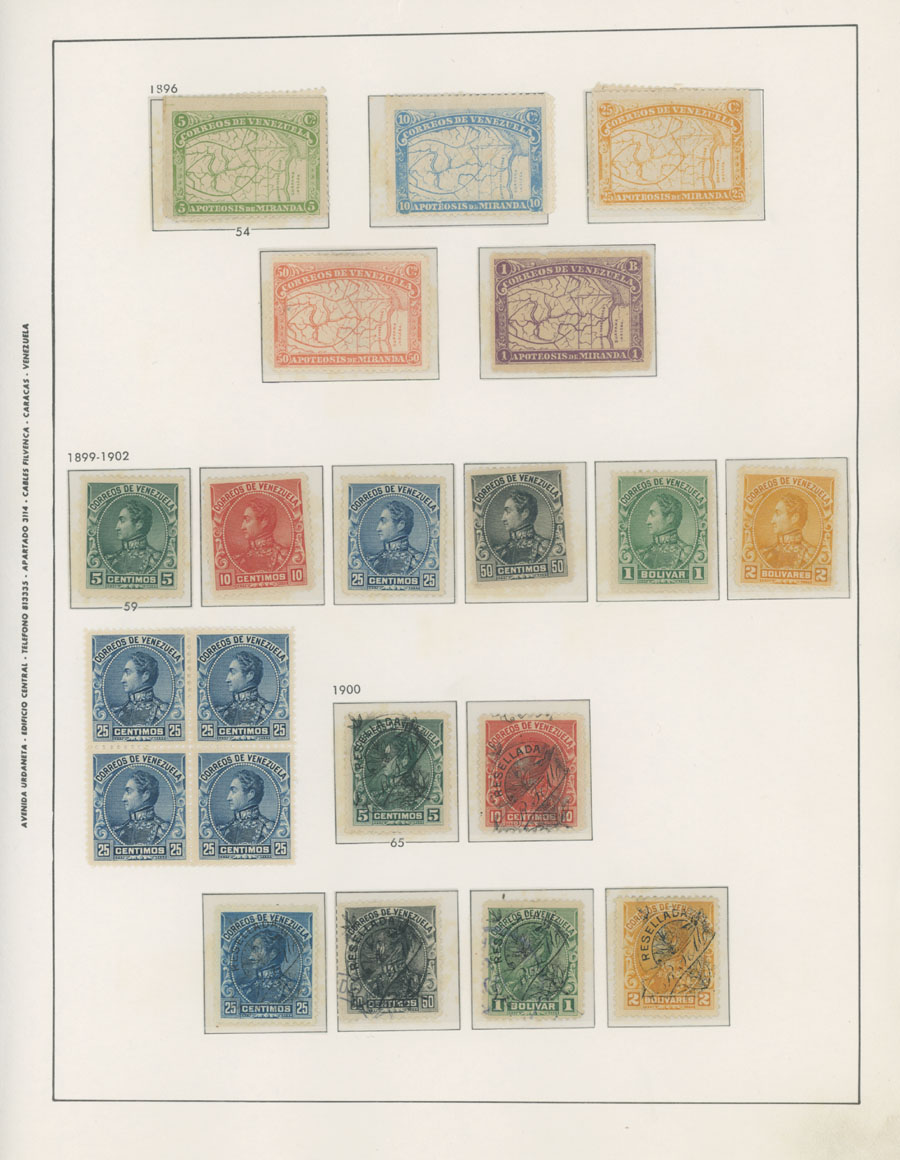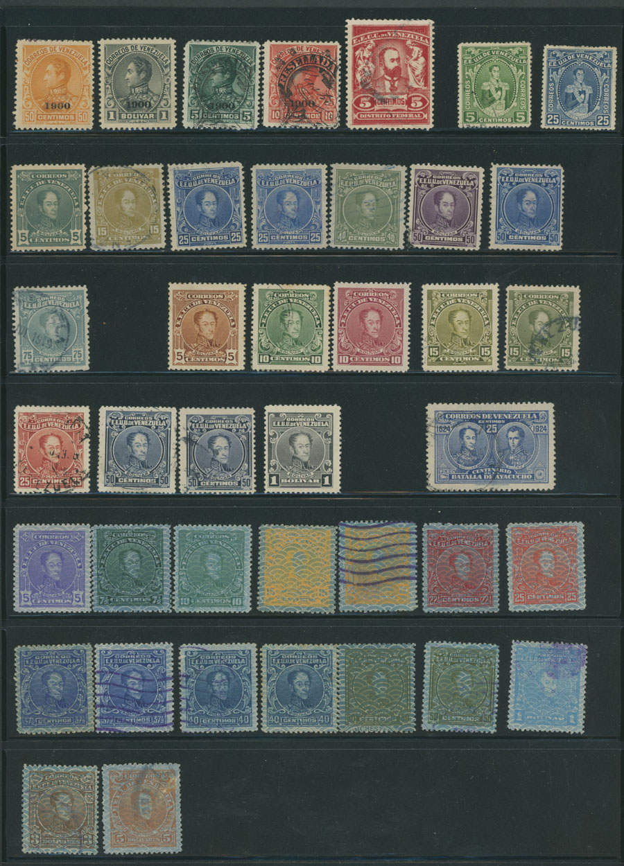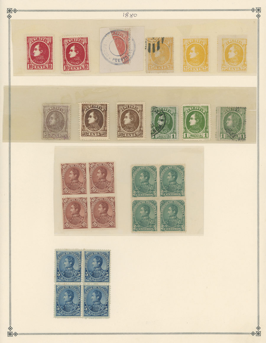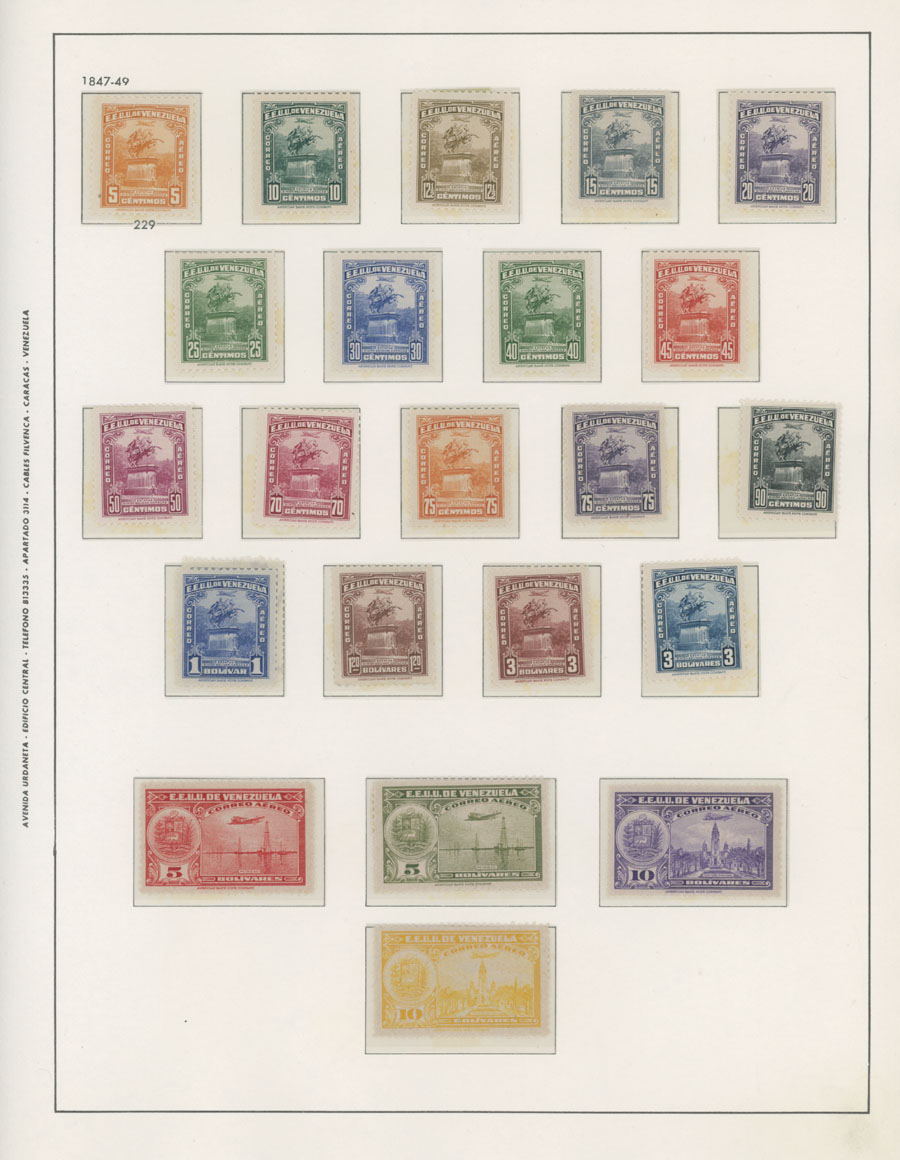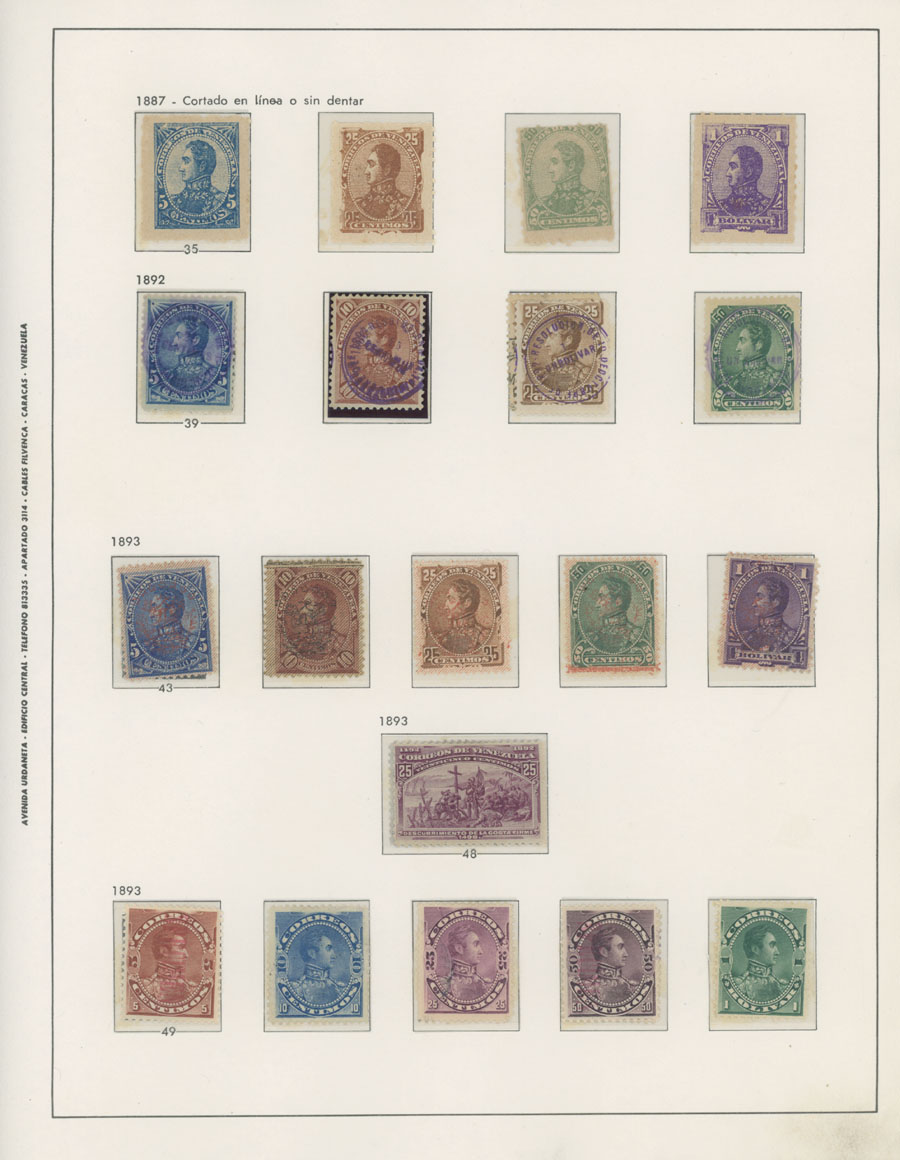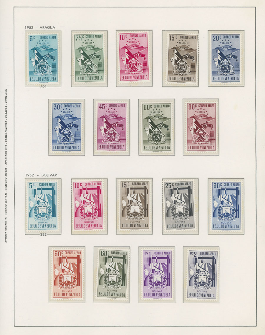 LARGE AND VALUABLE COLLECTION IN TWO LARGE ALBUMS: 1859-1984, about 2600 mostly mint stamps, 37 souvenir and miniature sheets, 15 FD covers, postage, air post and back of the book material, starting with Coat of Arms from 1859-77, then numerous Bolivar definitives, some nice perforation and printing errors, ”Provinces” long postage and air post issues, very well completed unit with some blocks of four and extra mainly classic duplicates on VARIO pages (over 300 stamps), nice collection, mainly full OG, generally LH, some NH, a few dozens used, F/VF, C.v. $14,250, including $7,400 in air post part plus about $1,500 in duplicates, Est. $2,500-$3,000