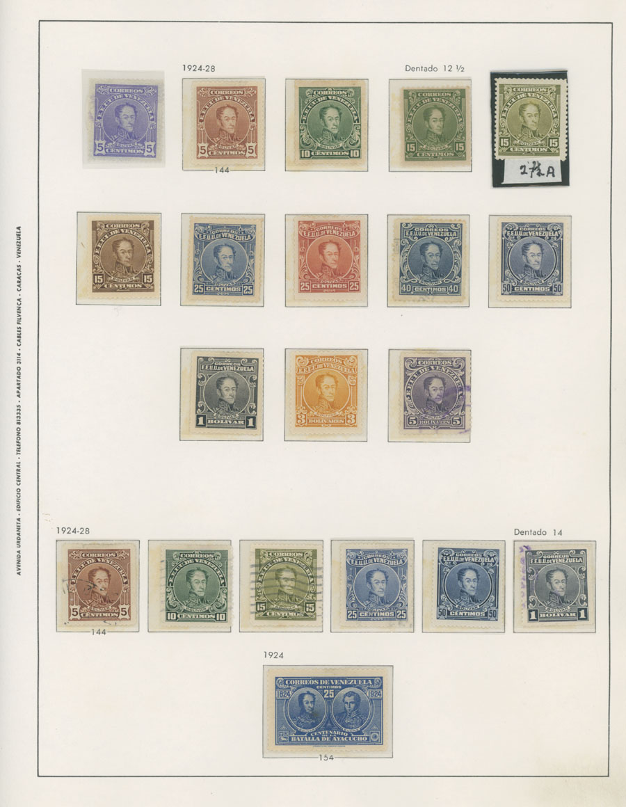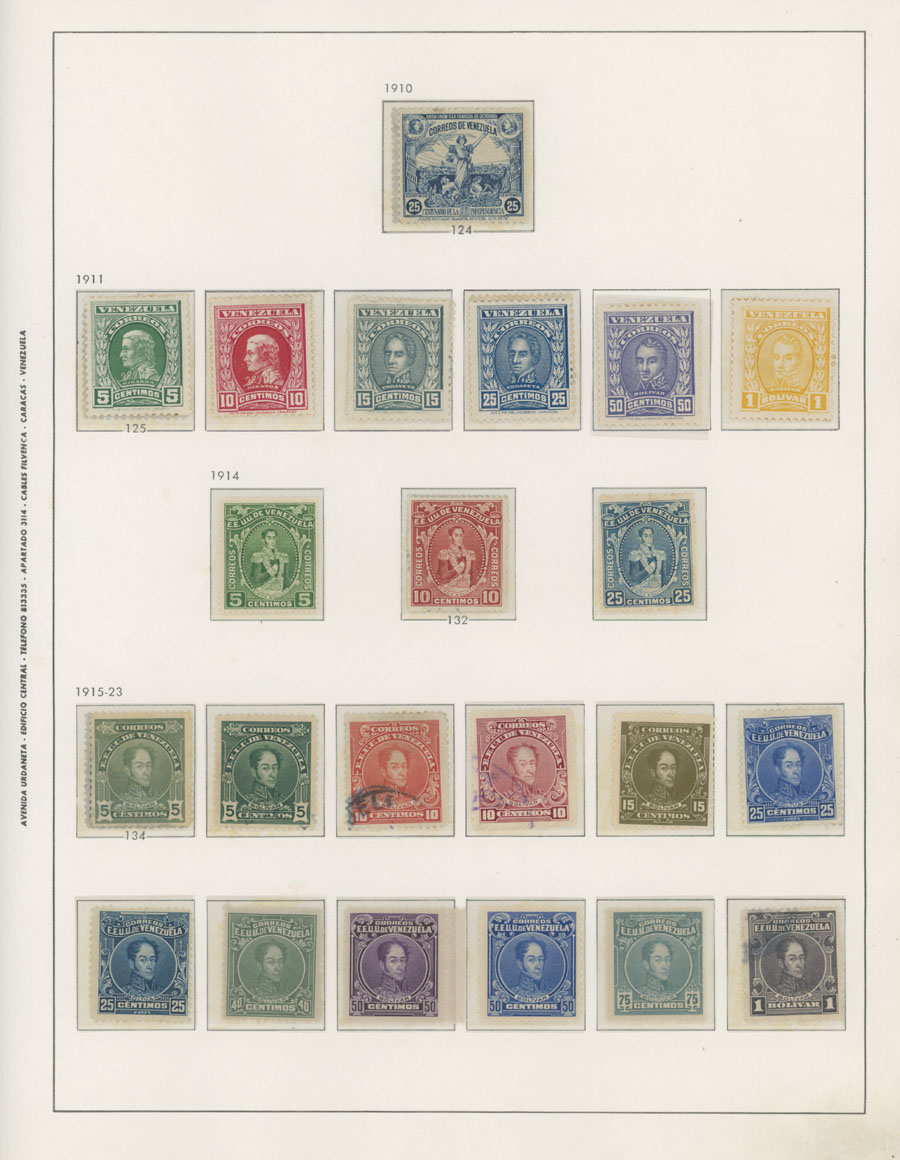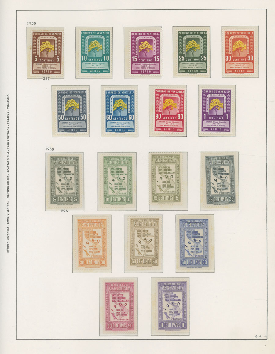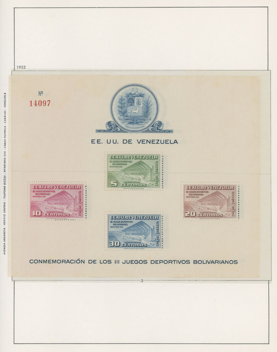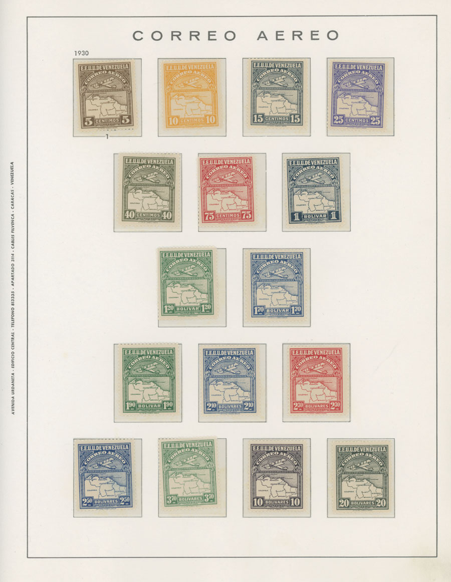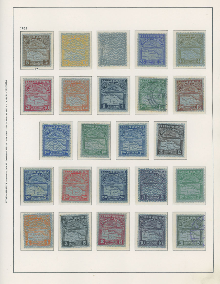 LARGE AND VALUABLE COLLECTION IN TWO LARGE ALBUMS: 1859-1984, about 2600 mostly mint stamps, 37 souvenir and miniature sheets, 15 FD covers, postage, air post and back of the book material, starting with Coat of Arms from 1859-77, then numerous Bolivar definitives, some nice perforation and printing errors, ”Provinces” long postage and air post issues, very well completed unit with some blocks of four and extra mainly classic duplicates on VARIO pages (over 300 stamps), nice collection, mainly full OG, generally LH, some NH, a few dozens used, F/VF, C.v. $14,250, including $7,400 in air post part plus about $1,500 in duplicates, Est. $2,500-$3,000