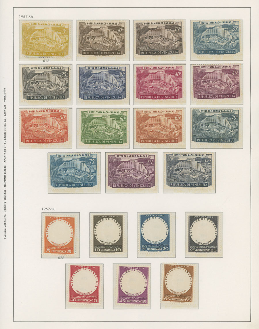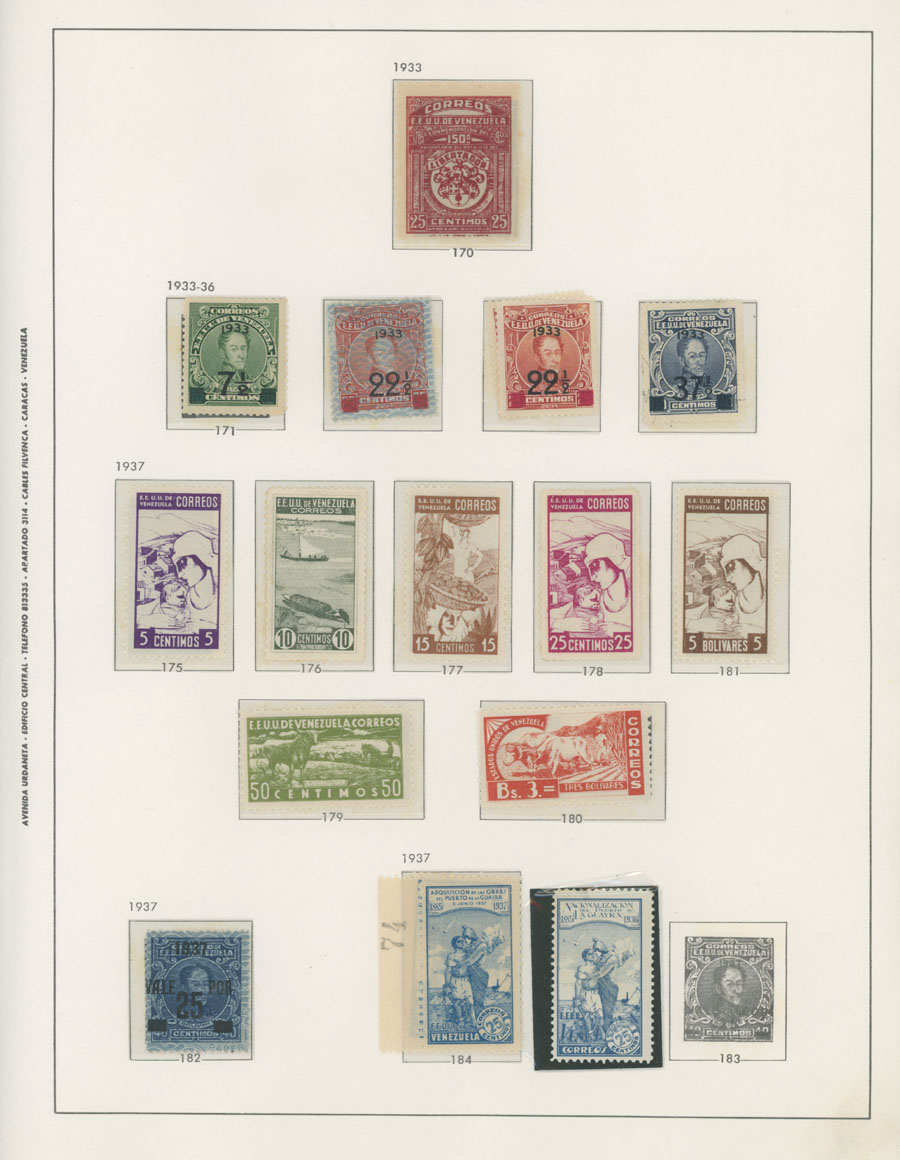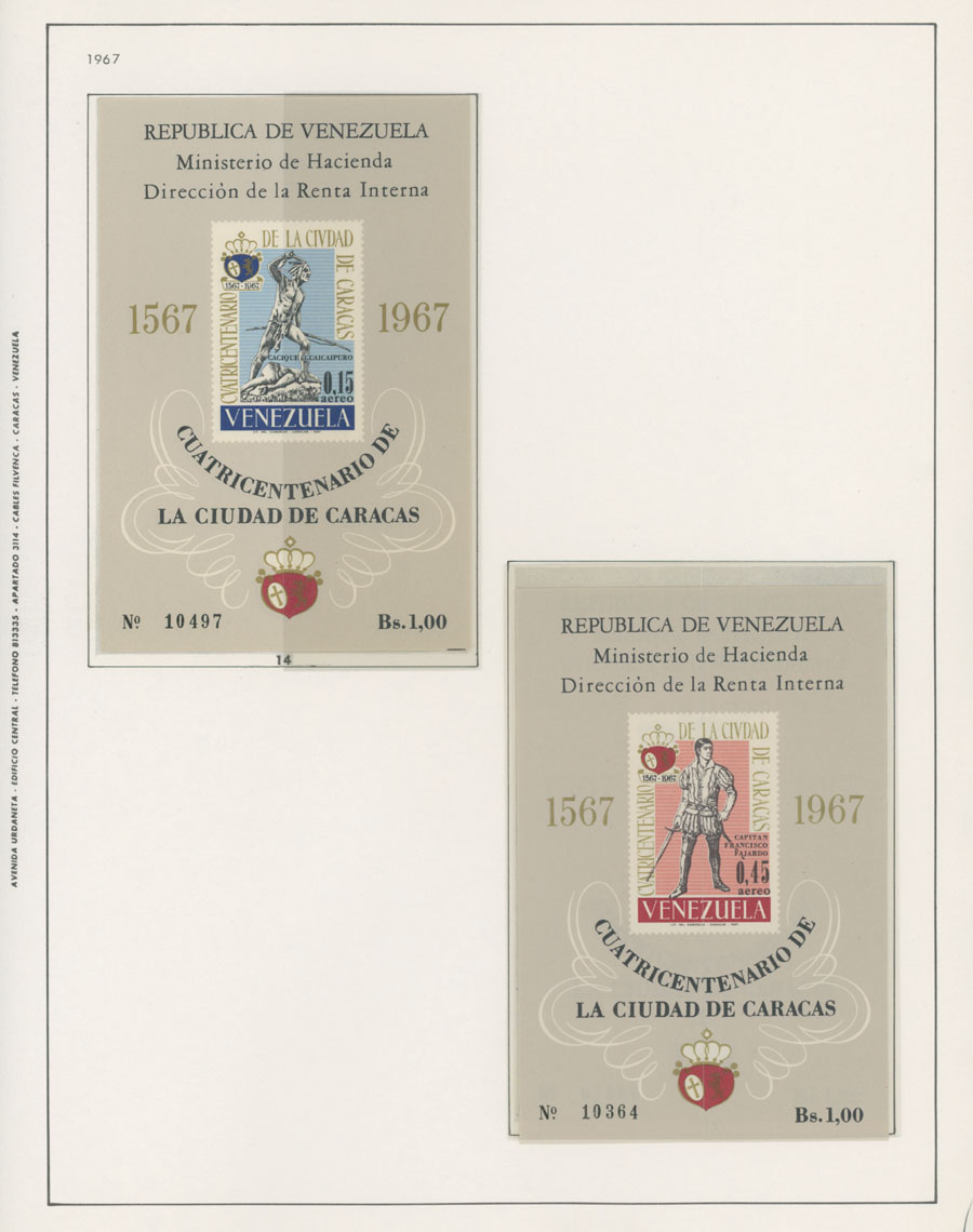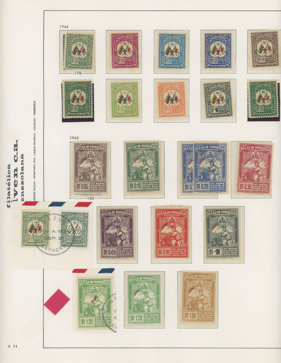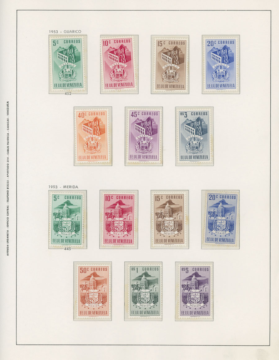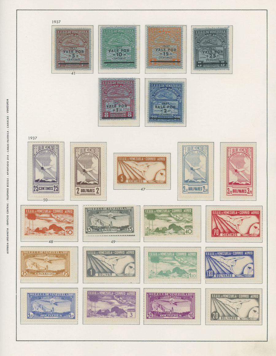 LARGE AND VALUABLE COLLECTION IN TWO LARGE ALBUMS: 1859-1984, about 2600 mostly mint stamps, 37 souvenir and miniature sheets, 15 FD covers, postage, air post and back of the book material, starting with Coat of Arms from 1859-77, then numerous Bolivar definitives, some nice perforation and printing errors, ”Provinces” long postage and air post issues, very well completed unit with some blocks of four and extra mainly classic duplicates on VARIO pages (over 300 stamps), nice collection, mainly full OG, generally LH, some NH, a few dozens used, F/VF, C.v. $14,250, including $7,400 in air post part plus about $1,500 in duplicates, Est. $2,500-$3,000
