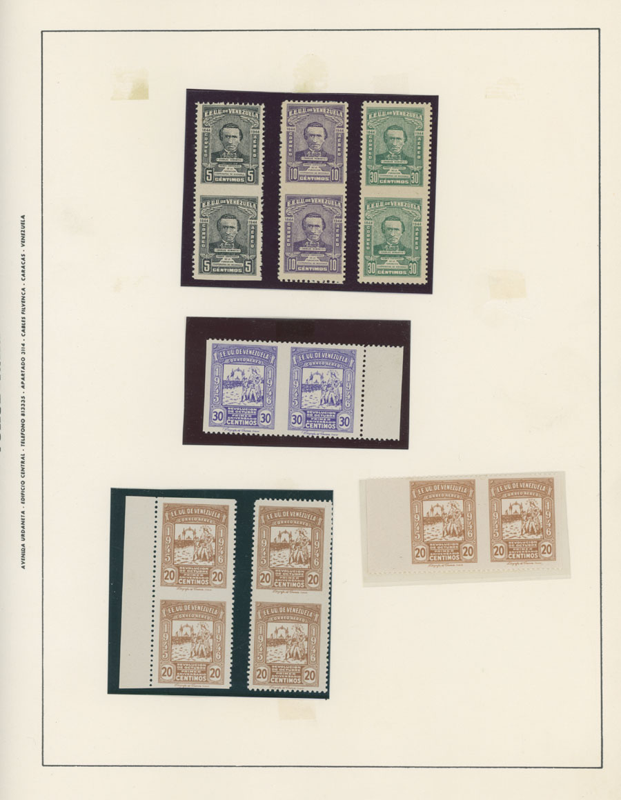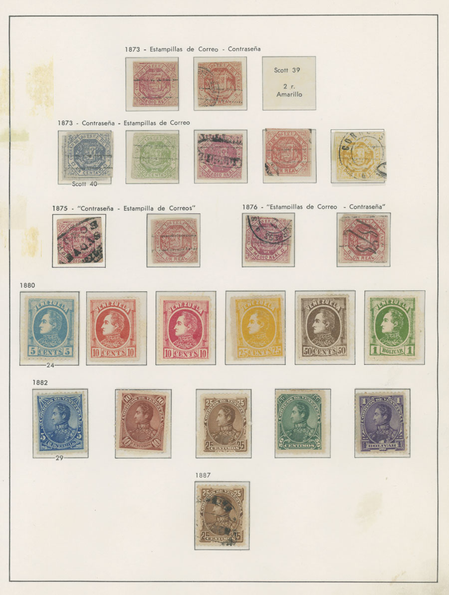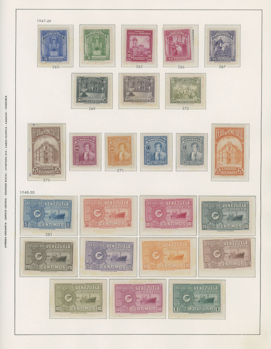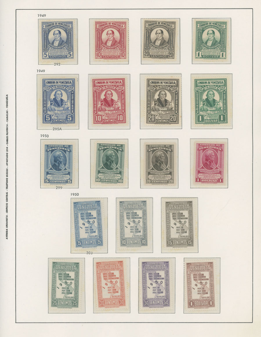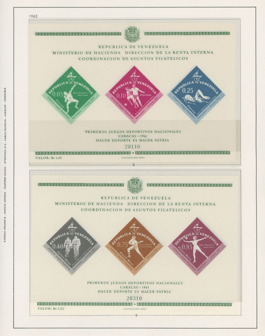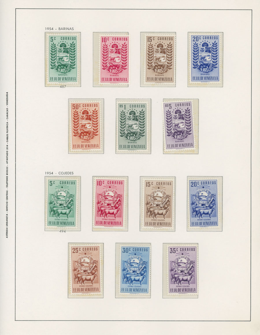 LARGE AND VALUABLE COLLECTION IN TWO LARGE ALBUMS: 1859-1984, about 2600 mostly mint stamps, 37 souvenir and miniature sheets, 15 FD covers, postage, air post and back of the book material, starting with Coat of Arms from 1859-77, then numerous Bolivar definitives, some nice perforation and printing errors, ”Provinces” long postage and air post issues, very well completed unit with some blocks of four and extra mainly classic duplicates on VARIO pages (over 300 stamps), nice collection, mainly full OG, generally LH, some NH, a few dozens used, F/VF, C.v. $14,250, including $7,400 in air post part plus about $1,500 in duplicates, Est. $2,500-$3,000
