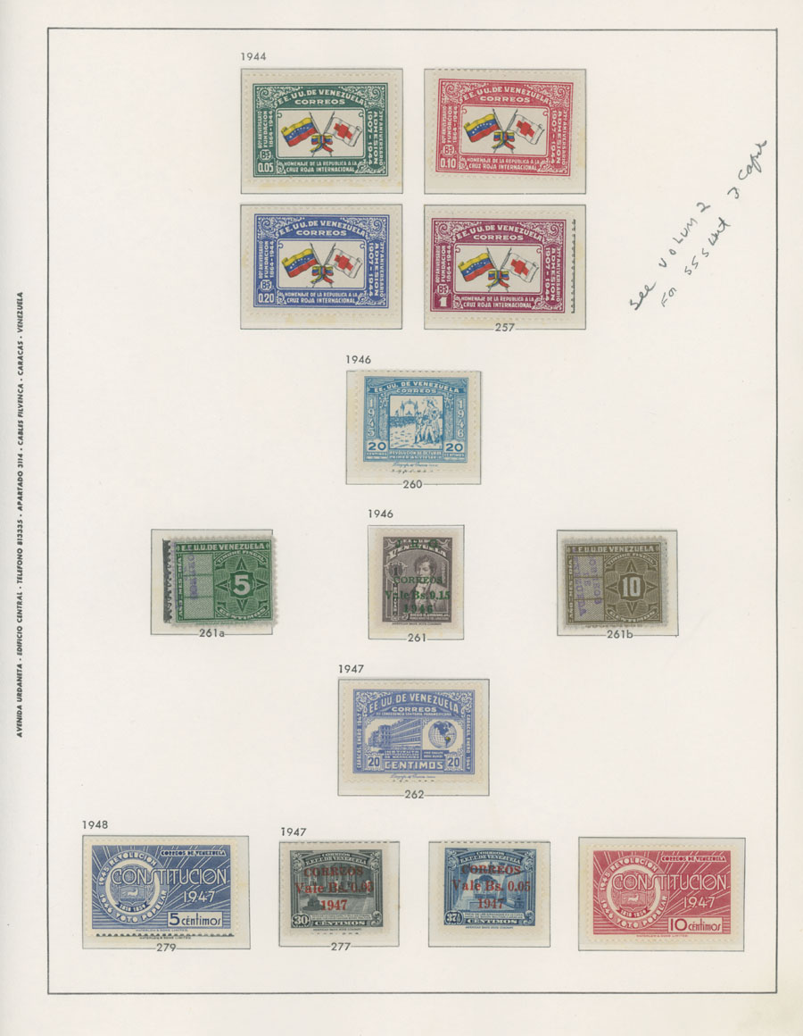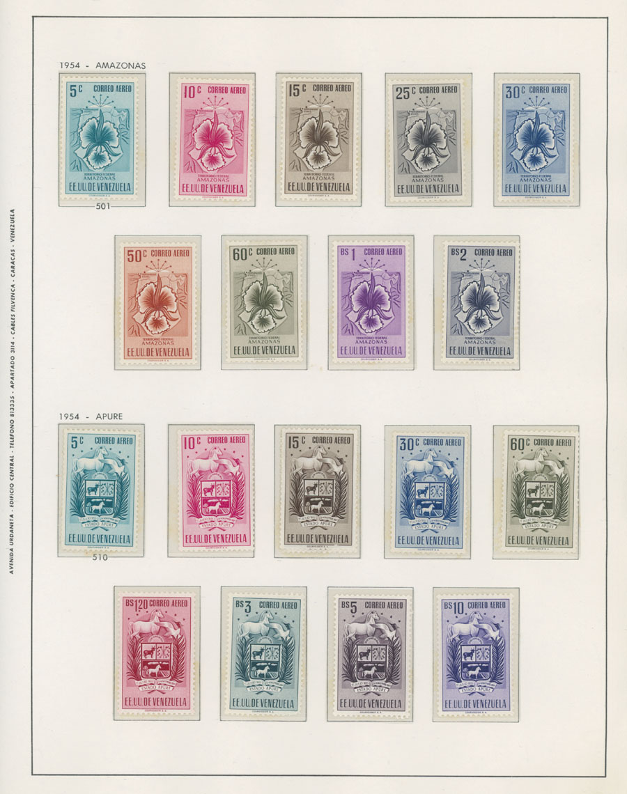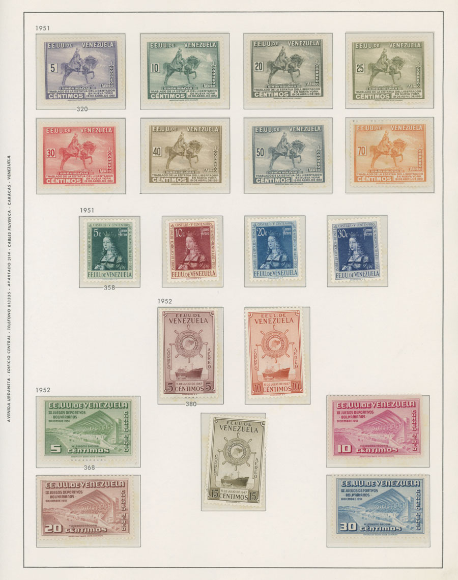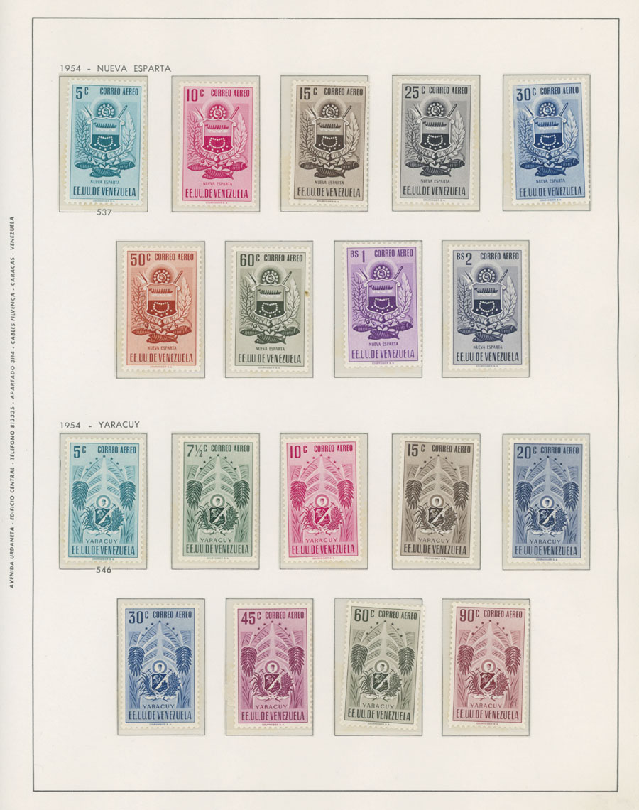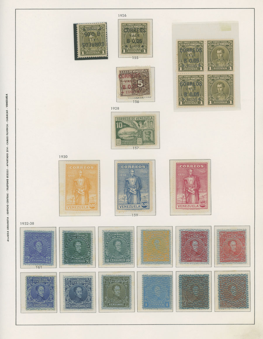 LARGE AND VALUABLE COLLECTION IN TWO LARGE ALBUMS: 1859-1984, about 2600 mostly mint stamps, 37 souvenir and miniature sheets, 15 FD covers, postage, air post and back of the book material, starting with Coat of Arms from 1859-77, then numerous Bolivar definitives, some nice perforation and printing errors, ”Provinces” long postage and air post issues, very well completed unit with some blocks of four and extra mainly classic duplicates on VARIO pages (over 300 stamps), nice collection, mainly full OG, generally LH, some NH, a few dozens used, F/VF, C.v. $14,250, including $7,400 in air post part plus about $1,500 in duplicates, Est. $2,500-$3,000