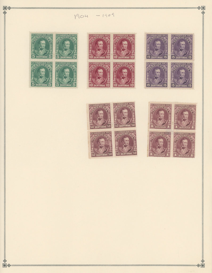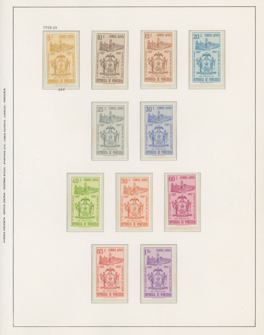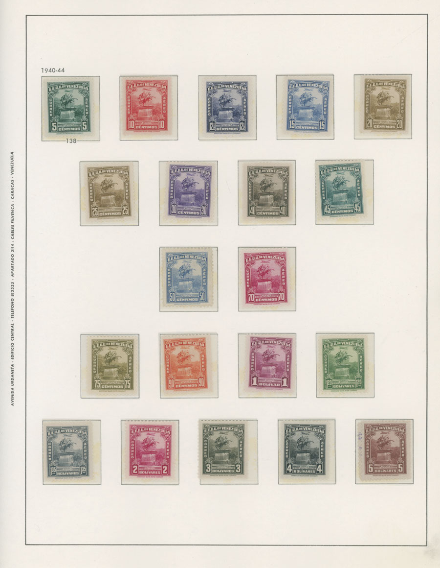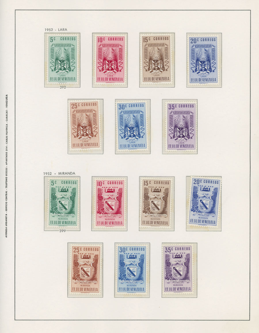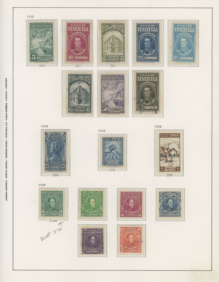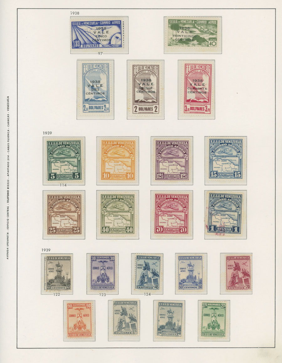 LARGE AND VALUABLE COLLECTION IN TWO LARGE ALBUMS: 1859-1984, about 2600 mostly mint stamps, 37 souvenir and miniature sheets, 15 FD covers, postage, air post and back of the book material, starting with Coat of Arms from 1859-77, then numerous Bolivar definitives, some nice perforation and printing errors, ”Provinces” long postage and air post issues, very well completed unit with some blocks of four and extra mainly classic duplicates on VARIO pages (over 300 stamps), nice collection, mainly full OG, generally LH, some NH, a few dozens used, F/VF, C.v. $14,250, including $7,400 in air post part plus about $1,500 in duplicates, Est. $2,500-$3,000
